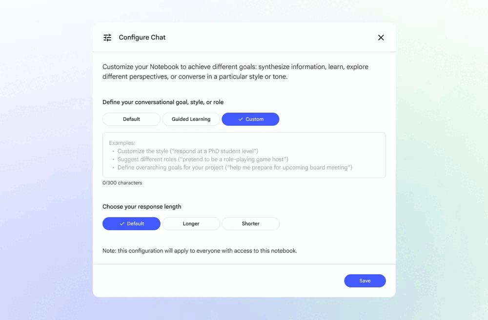 Além disso, agora também é possível definir funções. Por exemplo, o NotebookLM pode se comportar como um examinador acadêmico rigoroso ou como um mestre de jogos criativo.