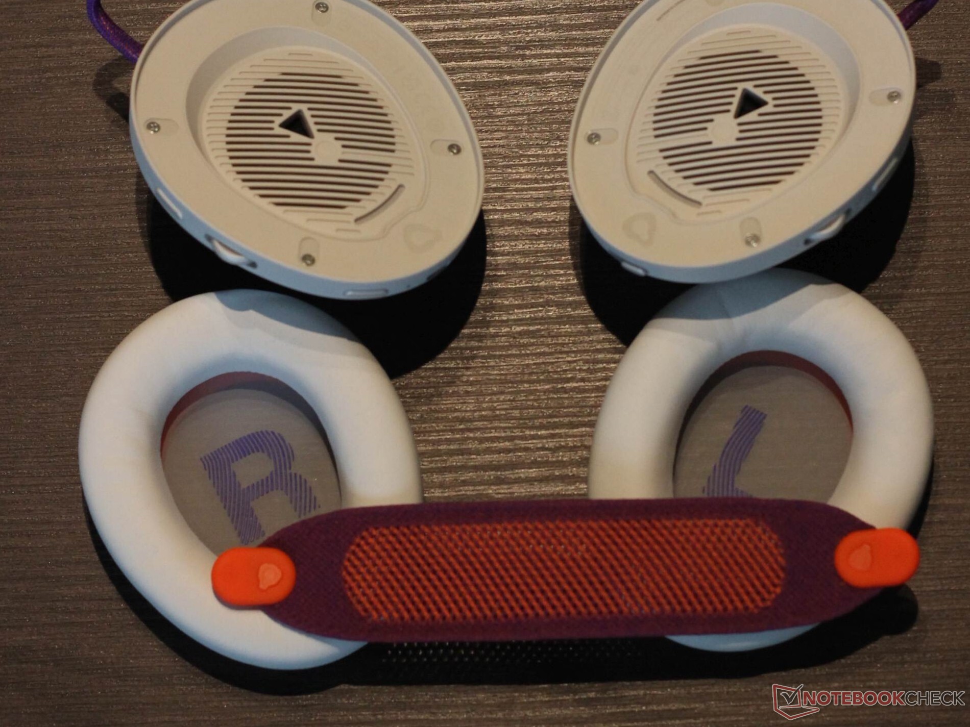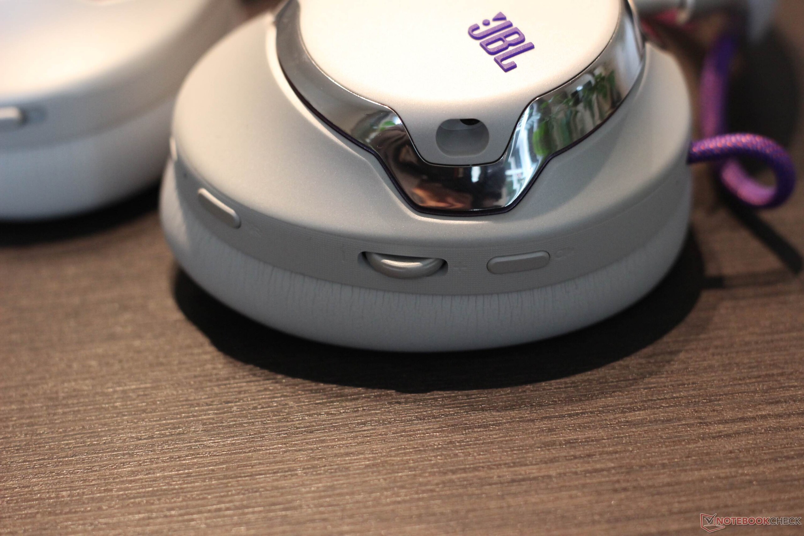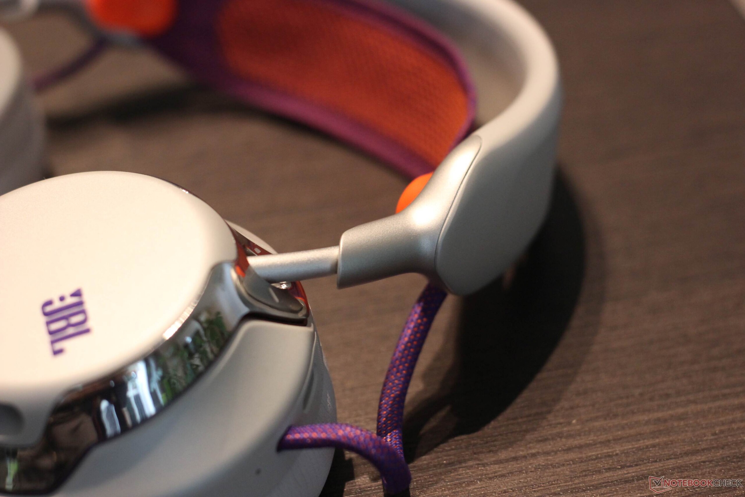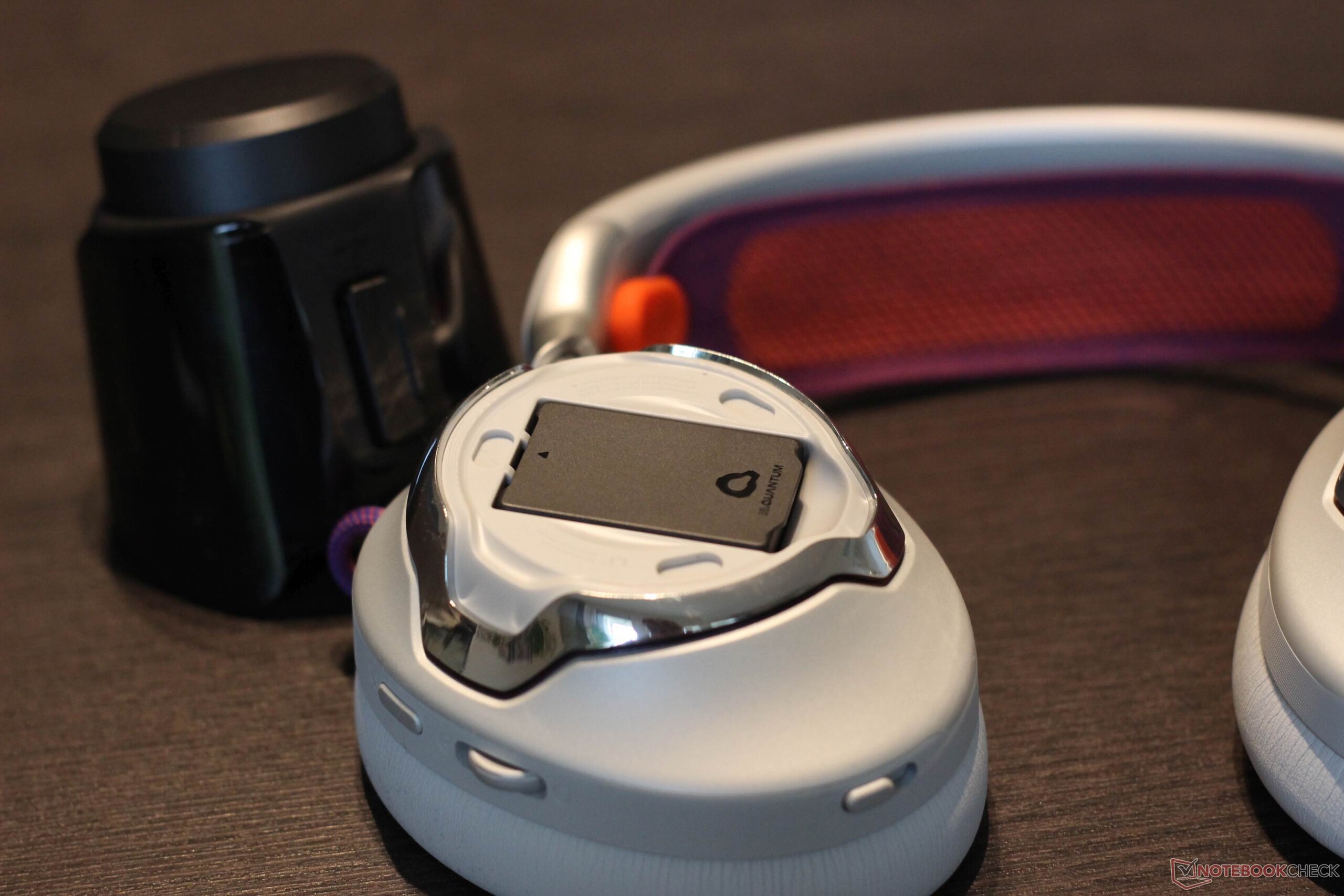 O JBL Quantum 950 Wireless vem com uma ampla gama de acessórios. Está incluída uma estação base que pode ser conectada via USB tipo C. Ela oferece várias funções: Ela não só funciona como um dongle de 2,4 GHz, mas também como uma unidade de controle e estação de carregamento para uma das duas baterias recarregáveis fornecidas. Um microfone boom e um microfone específico para calibração também estão incluídos. Uma bolsa de tecido muito útil também está incluída. O headset em si vem com detalhes em metal e três botões, dois controles rotativos e um controle deslizante. Os botões oferecem um ponto de pressão agradável. O próprio fone de ouvido tem um design marcante com detalhes em metal e o metal também é usado como material. As almofadas de ouvido são mantidas no lugar magneticamente e são fáceis de substituir. A faixa de cabeça em si é feita de um tecido de malha, que também pode ser substituído - esse é um recurso geralmente muito positivo. O mesmo se aplica à bateria, que também pode ser facilmente substituída. Como esperado, as superfícies metálicas são um pouco suscetíveis a impressões digitais. A versão branca do modelo não economiza nos contrastes. A faixa de cabeça é roxa e laranja, assim como os cabos bem visíveis e o logotipo da JBL.