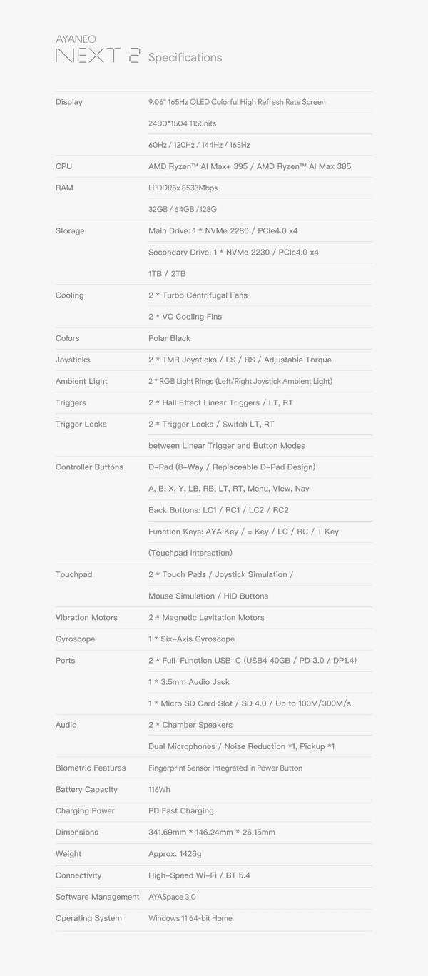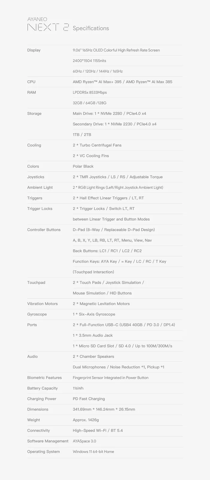 Especificamente, a Ayaneo oferece o Next 2 com o Ryzen AI Max 385 ou Ryzen AI Max+ 395assim como o OneXPlayer Apex e o GPD Win 5(atualmente, US$ 2.399,99 na Amazon). O Next 2 se diferencia de seus pares com uma tela OLED de 9,06 polegadas e uma bateria externa de 116 Wh. Ao todo, o Next 2 pesa 341,69 x 146,24 x 26,15 mm e pesa aproximadamente 1,43 kg. Consulte a folha de especificações abaixo para obter todos os detalhes técnicos.