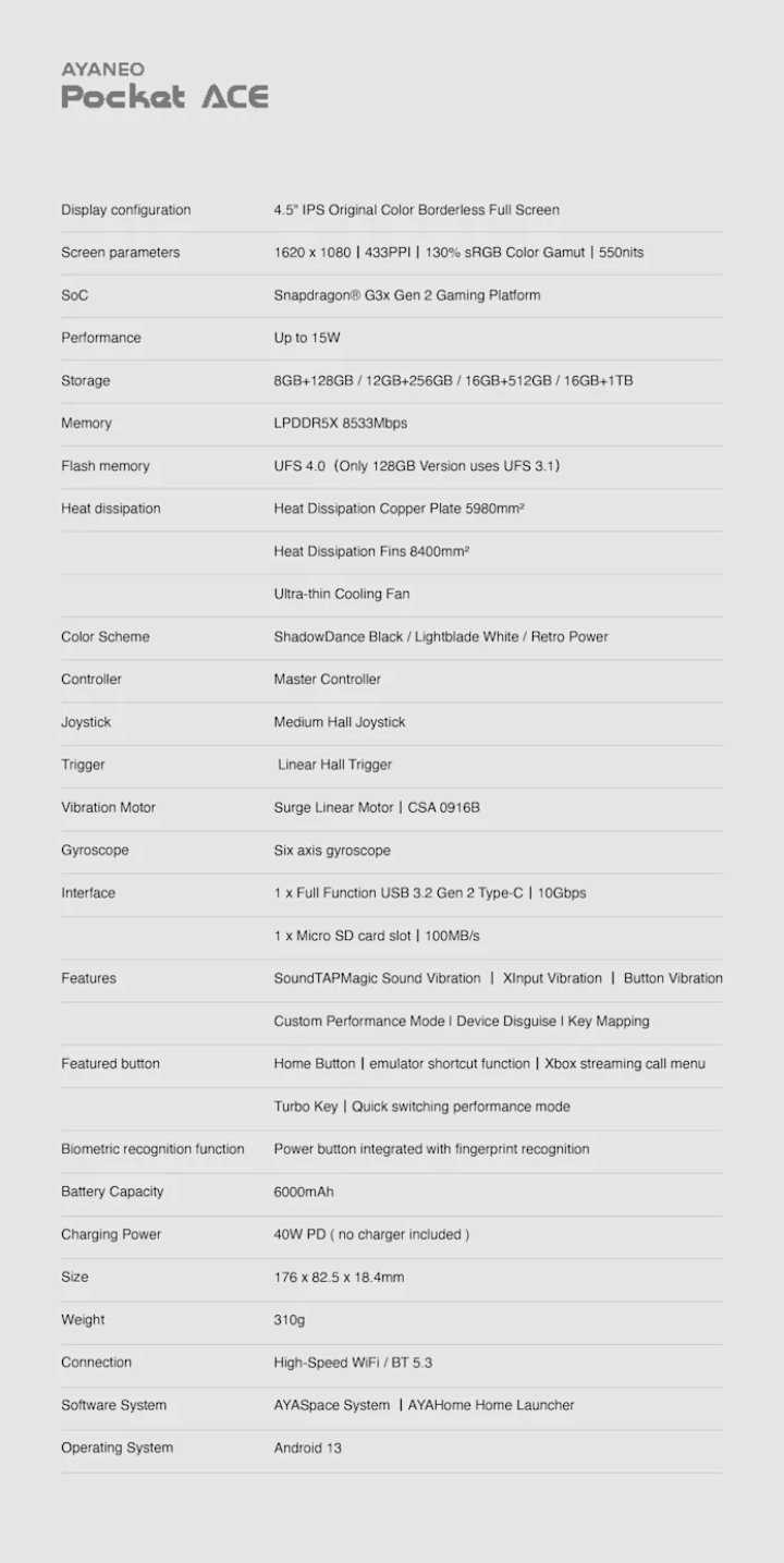 De acordo com a Ayaneo, todos os SKUs do Pocket Ace serão fornecidos com RAM LPDDR5X com clock de 8.533 Mbps. Por outro lado, todas as variantes de armazenamento, exceto as de 128 GB, utilizam memória UFS 4.0. Em comparação, as opções de 128 GB apresentam armazenamento flash UFS 3.1 mais lento. Independentemente disso, a Ayaneo equipa todas as variantes com uma tela IPS de 4,5 polegadas que produz 1.620 x 1.080 pixels com 550 nits de brilho máximo.
