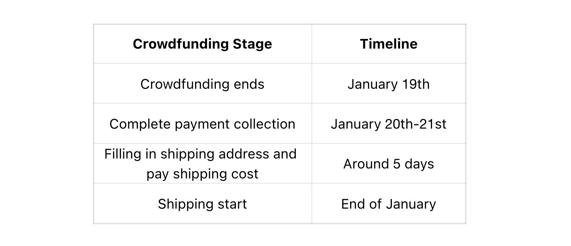 Aparentemente, de acordo com as regras do Indiegogo, a cobrança do pagamento deve ocorrer em até 15 dias após o término da campanha. Depois disso, são necessários mais 5 a 15 dias para que os apoiadores forneçam seus detalhes de envio e paguem as taxas de envio. Com base no exposto acima, o envio deve começar no final de fevereiro.