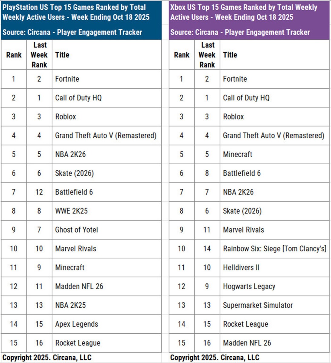 Mat Piscatella compartilhou dados do Circana no Blueskymostrando o envolvimento dos jogadores no PlayStation e no Xbox. As estatísticas abrangem a semana que terminou em 18 de outubro, incluindo os primeiros dias após a data de lançamento do Battlefield 6. Medindo o total de usuários ativos nos EUA, o Call of Duty HQ está em segundo lugar, atrás do Fortnite. Enquanto isso, o novo jogo de tiro da Dice está em sétimo lugar no PlayStation e em sexto nos consoles Xbox.
