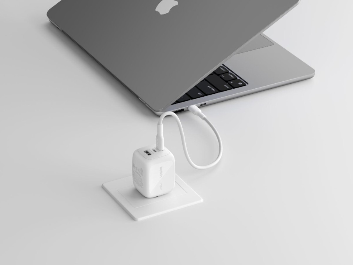 Como mencionado, o adaptador da Belkin pode produzir 70 W por meio de suas duas portas USB-C e USB-A adicional, semelhante ao Carregador de 3 portas Anker 70W. Cada porta USB-C pode fornecer os 70 W completos por conta própria, com divisão de energia para 45 W/25 W ou 45 W/22,5 W quando dois dispositivos estão conectados e 45 W/12 W/12 W quando todas as três portas estão em uso. Na prática, isso significa que ele pode operar confortavelmente um notebook como o macBook Air M4 de 15 polegadas de 15 polegadas, enquanto carrega dois outros aparelhos ao mesmo tempo.