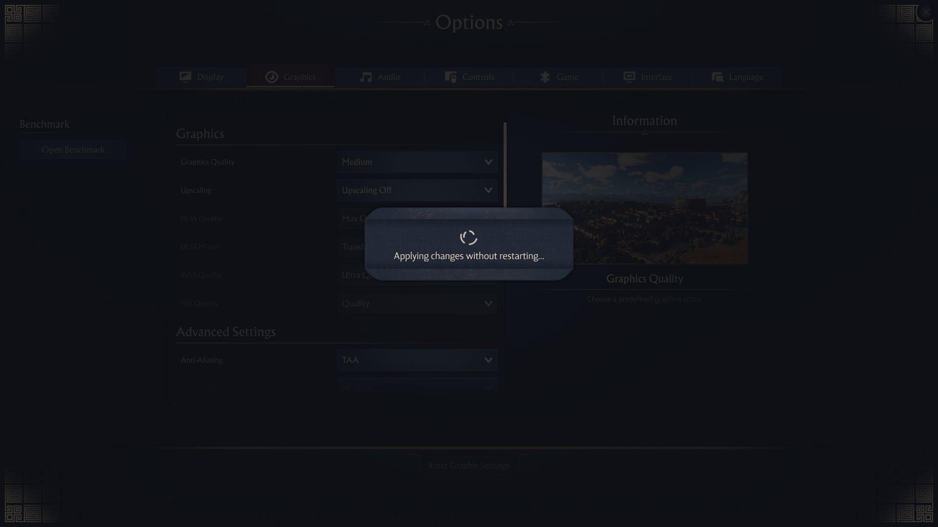 O menu de opções em duas partes (configurações de exibição e de gráficos) oferece todas as opções usuais e, felizmente, aplica as alterações sem a necessidade de reiniciar o computador. No entanto, a aplicação de novas configurações pela primeira vez pode demorar um pouco mais; no nosso caso, tivemos que esperar até um minuto.