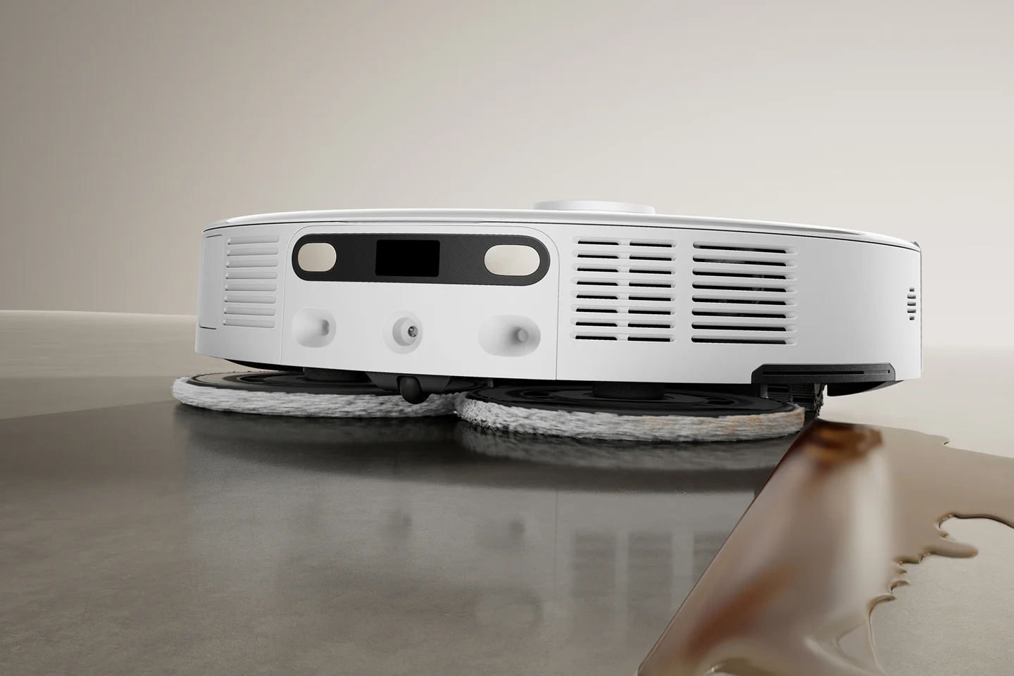 Isso também se aplica a um dos dois esfregões giratórios na parte traseira, que se estende lateralmente a partir da carcaça para limpar ao longo de rodapés e móveis. Os esfregões giram a até 260 rpm e são projetados para remover manchas com 12 N de pressão para baixo. Ainda não se sabe se isso funciona bem na prática. Em geral, essa tecnologia de esfregão é inferior a um esfregão de rolo, como o usado no Mova S70 Roller.