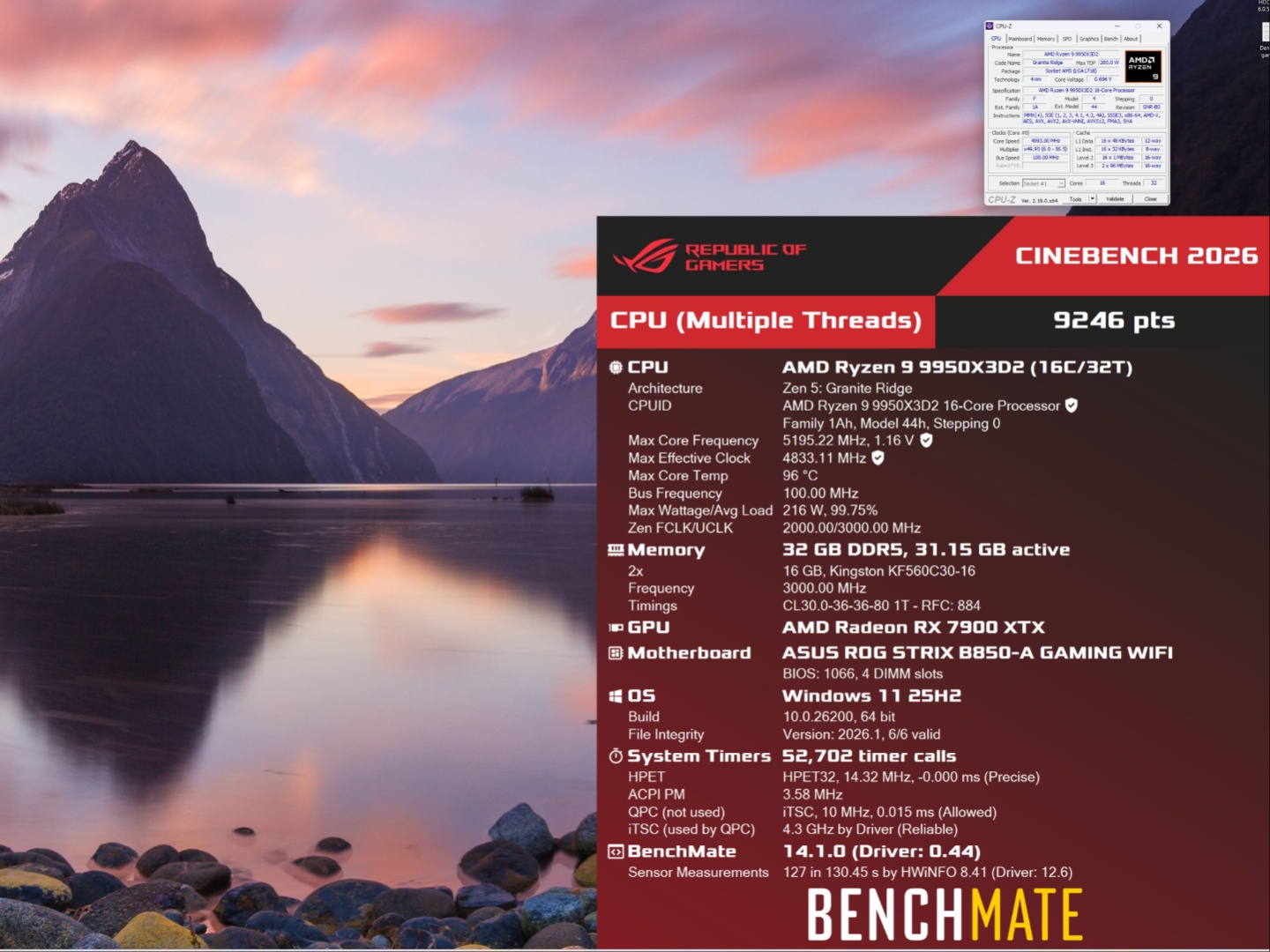 Os benchmarks postados no HWBOT são do usuário Stoikov e incluem 7-Zipcinebench 2026 (single e multi-core), e Cinebench R23 multicore scores. Todos os quatro benchmarks parecem ter sido executados com um cooler a ar, 32 GB de RAM DDR5, uma Radeon RX 7900 XTX, na placa-mãe Asus ROG Strix B850-A Gaming WIFI.