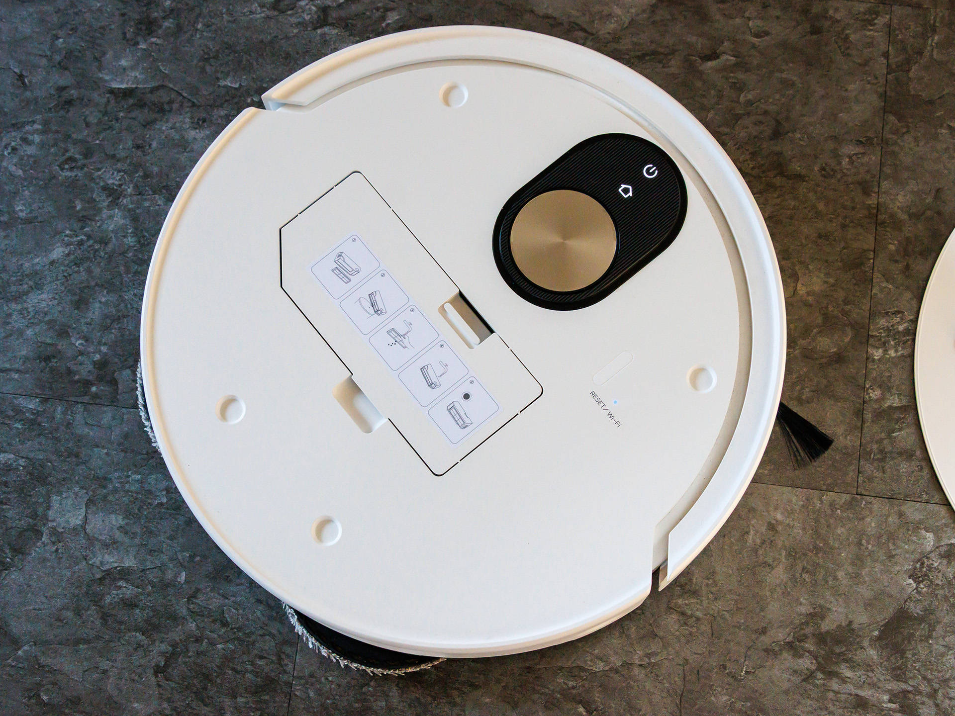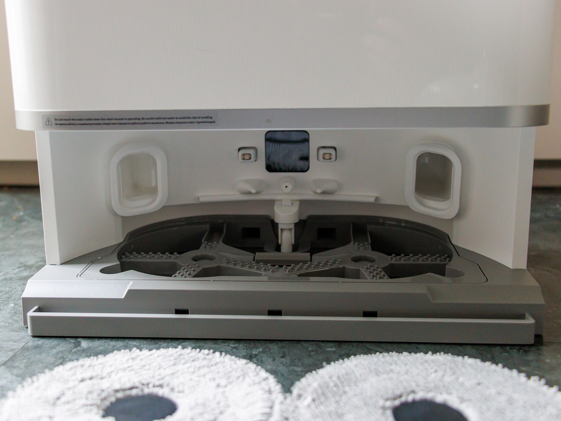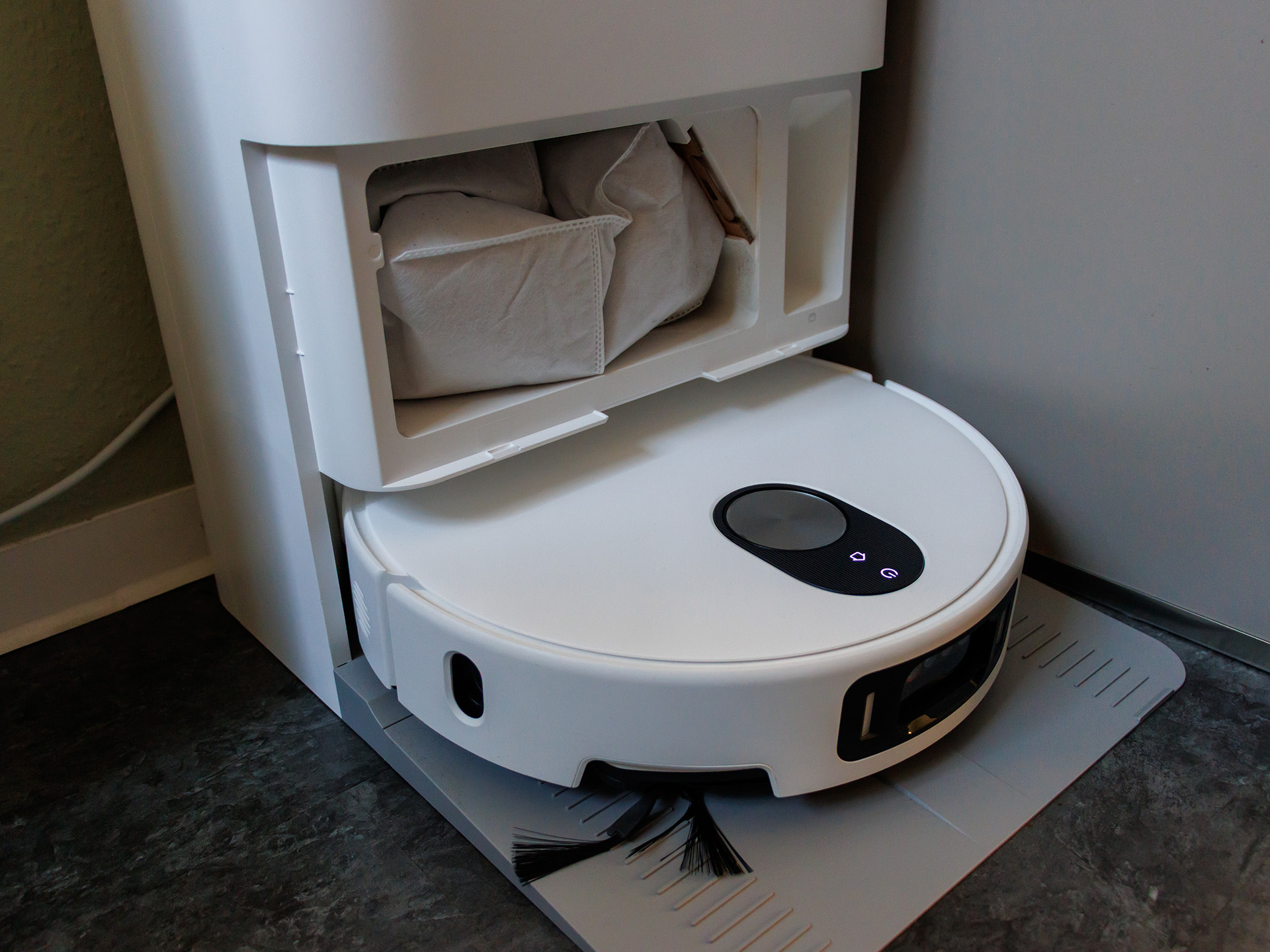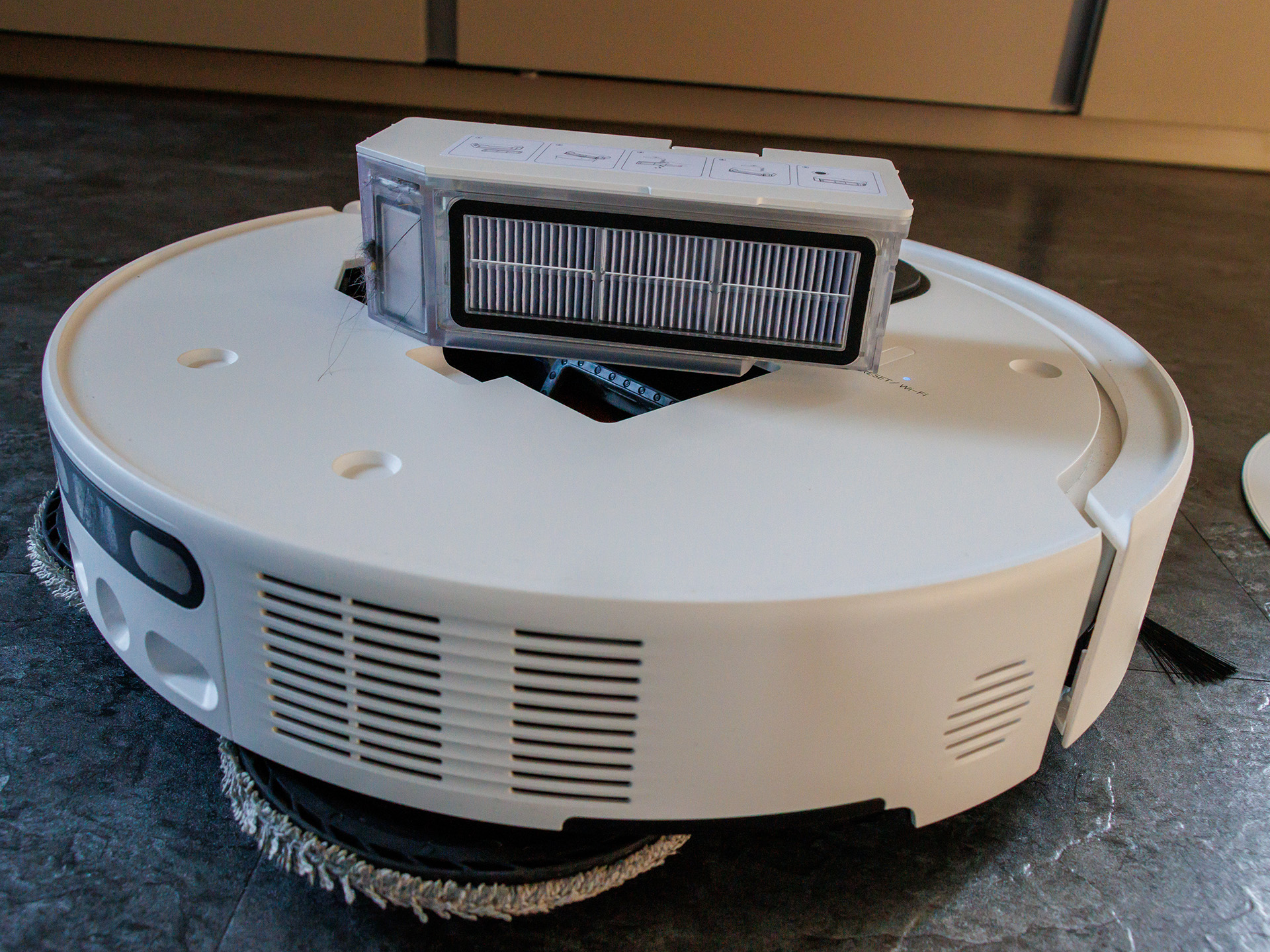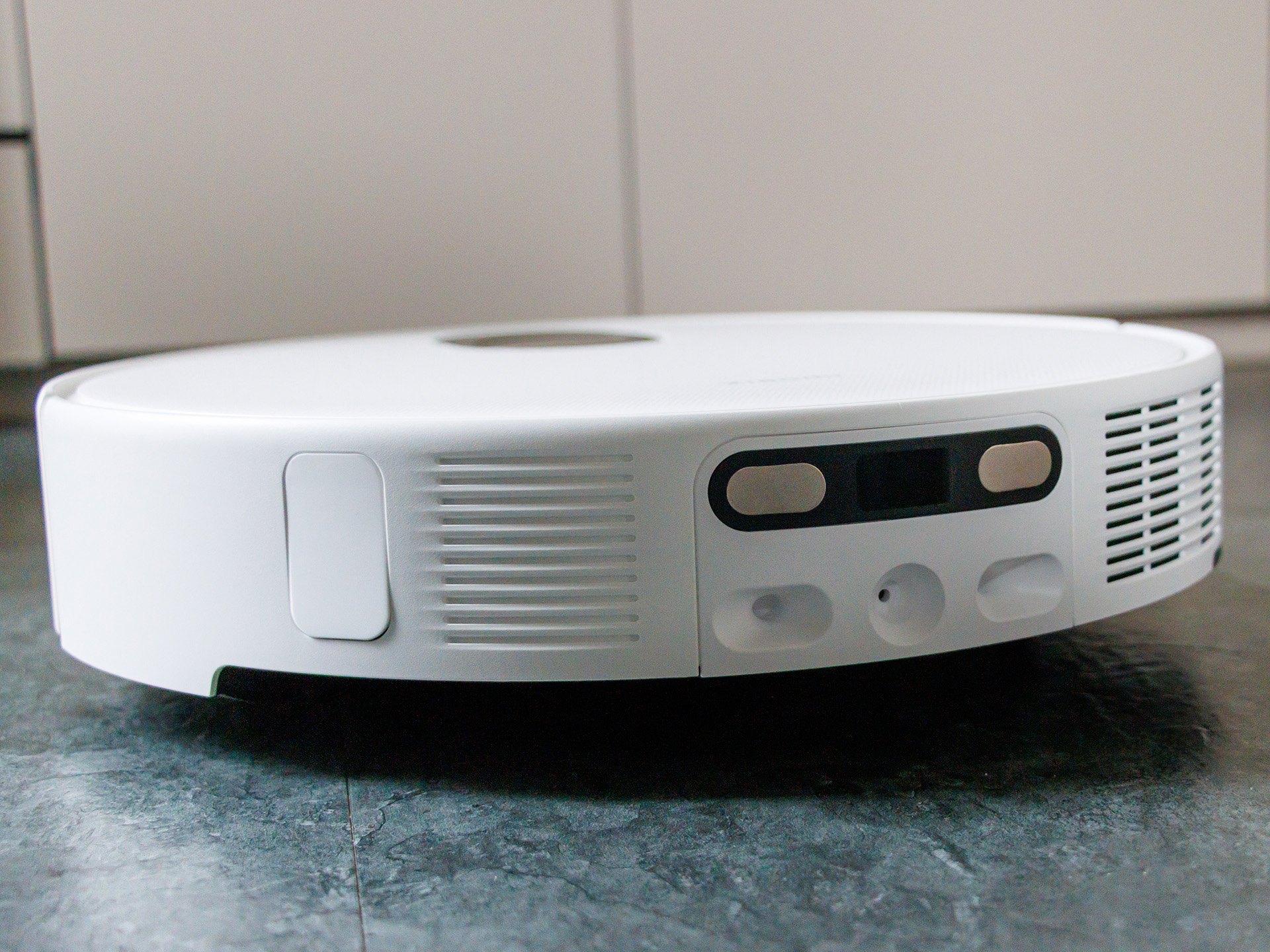 Na parte frontal, há uma configuração de câmera tripla AI composta por câmeras RGB e infravermelhas, além de um projetor de pontos infravermelhos 3D, que foi projetado para detectar mais de 200 objetos em tempo real. Isso geralmente funciona de forma confiável no uso diário, mas pequenos tijolos de Lego são frequentemente ignorados e até mesmo uma moeda de 1 centavo foi parar no saco de pó. Durante os testes, o aspirador robô também teve problemas para detectar um cabo embaixo do sofá.