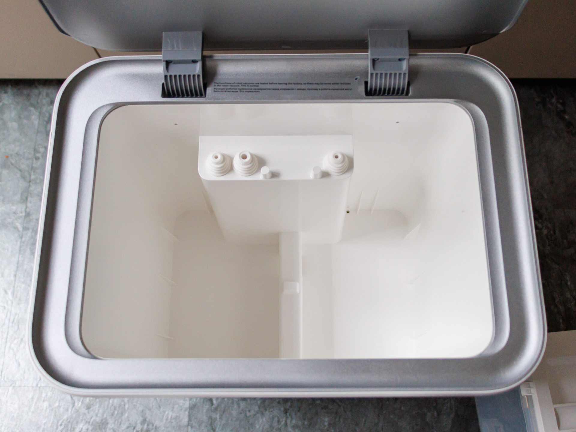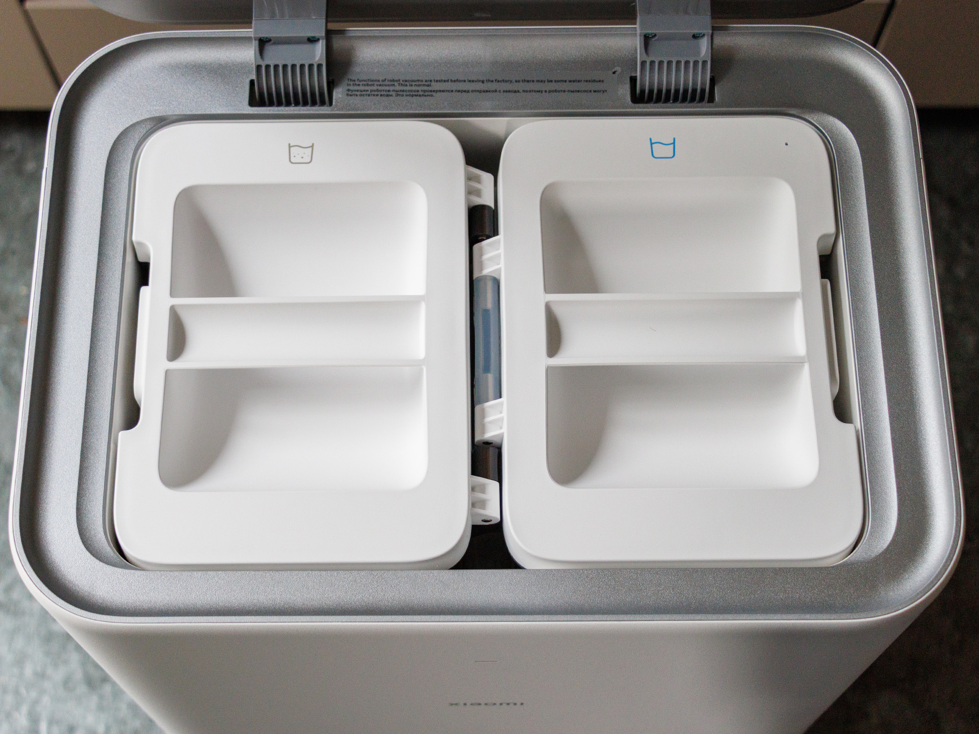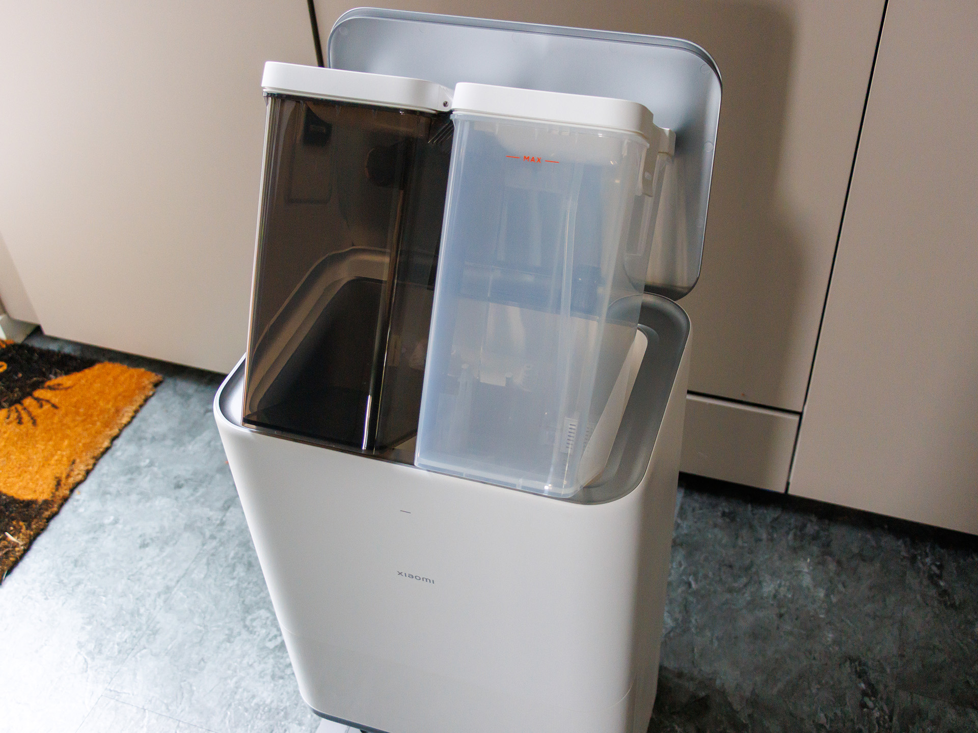 A lixeira é bem pequena, portanto, o robô aspirador/mopa precisa retornar à estação de carregamento com mais frequência ao limpar grandes áreas. Os esfregões também podem ser limpos automaticamente com água quente a 80°C. Infelizmente, o Xiaomi Robot Vacuum 5 Pro não tem um tanque de solução de limpeza; em vez disso, ele passa o esfregão apenas com água. A quantidade de água utilizada fora da caixa é bastante baixa, e é por isso que realizamos a maior parte do teste no nível 3. Um tanque de água cheio na estação de carregamento foi suficiente para um pouco mais de 240 metros quadrados.