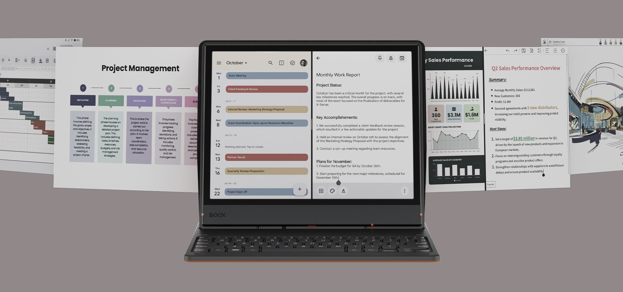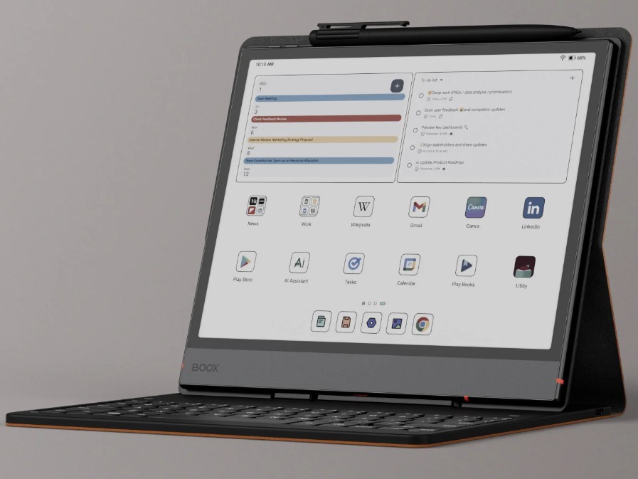 A Boox o envia com uma caneta stylus com cinco pontas extras e uma capa magnética protetora que pode ser usada nas orientações retrato ou paisagem. Se o senhor escolher o pacote da capa do teclado, terá um desconto de ~$33/€33 e pagará $606,99/€606,99 em vez de $639,98/€639,98.