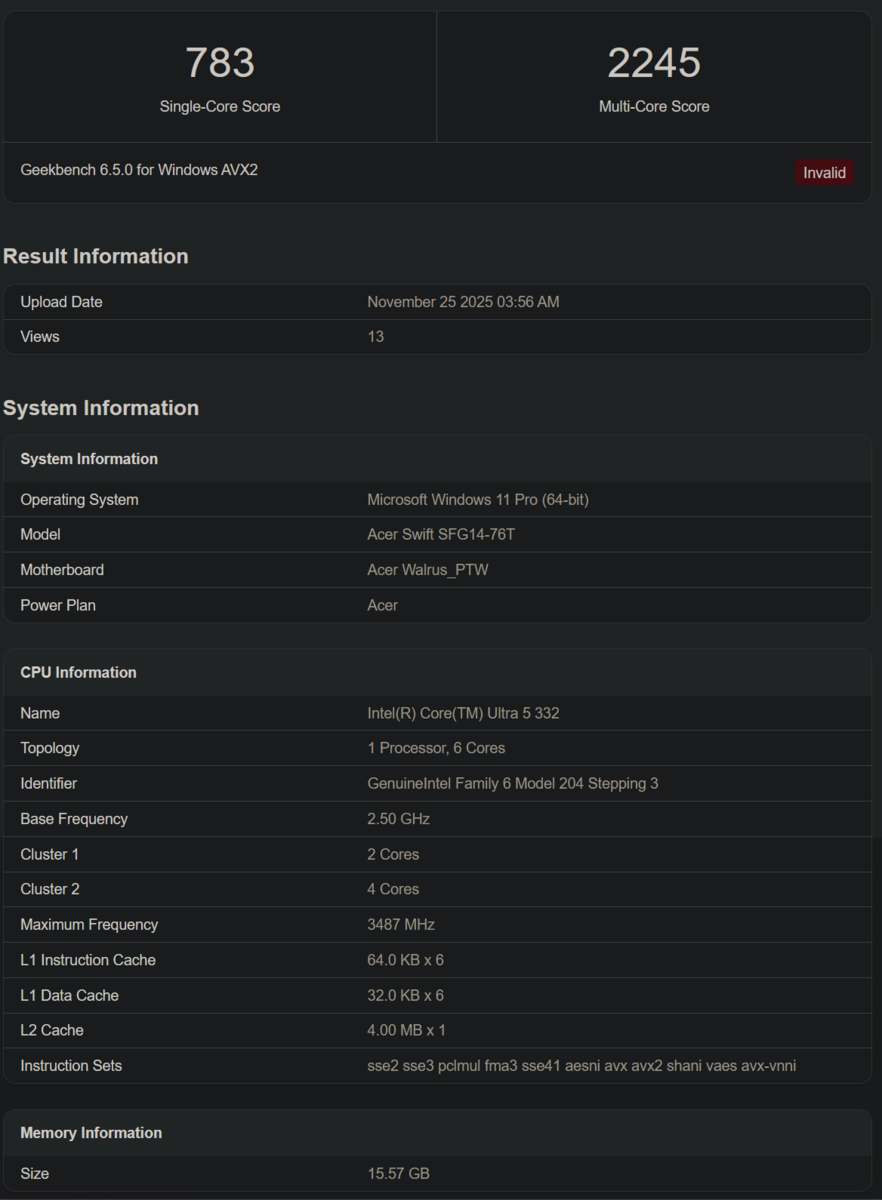 Passando para o Core Ultra 5 322 de nível básico, sua pontuação no Geekbench https://browser.geekbench.com/v6/cpu/15217168 está marcada como inválida. Mas a listagem esclarece suas especificações, ou seja, 2 núcleos P, 2 núcleos E e 2 núcleos LPE. Esse laptop em particular pertence à linha Acer Swift e possui 16 GB de RAM, uma GPU RTX 5060 e um adaptador Intel Graphics não especificado.