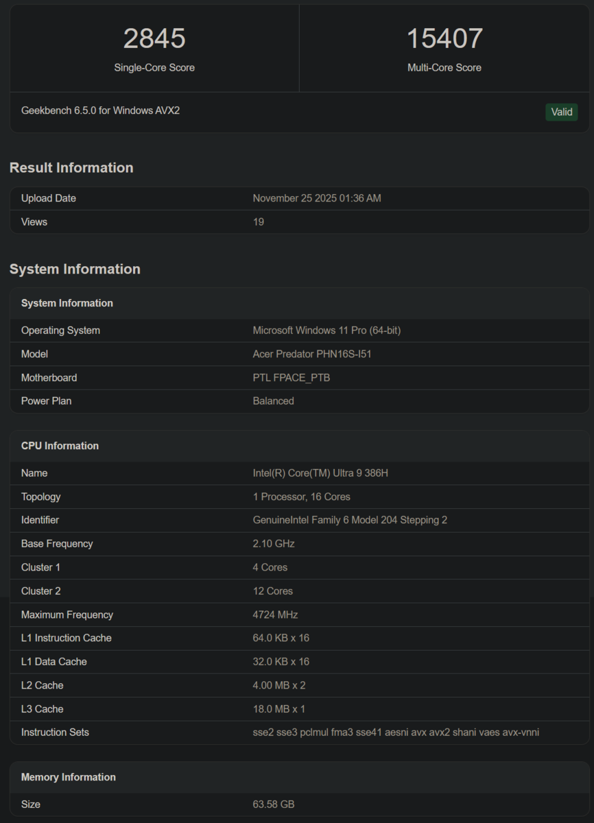 Os núcleos P aumentam para 4,7 GHz, um pouco abaixo da velocidade de clock que, segundo rumores de 4,9 GHz. Para a GPU, ele usa uma SKU Intel Graphics não especificada (e não a Arc B390) em combinação com uma GeForce RTX 5060 da Nvidia. Por fim, o laptop tem 64 GB de RAM e parece ser uma variante do próximo Acer Predator.