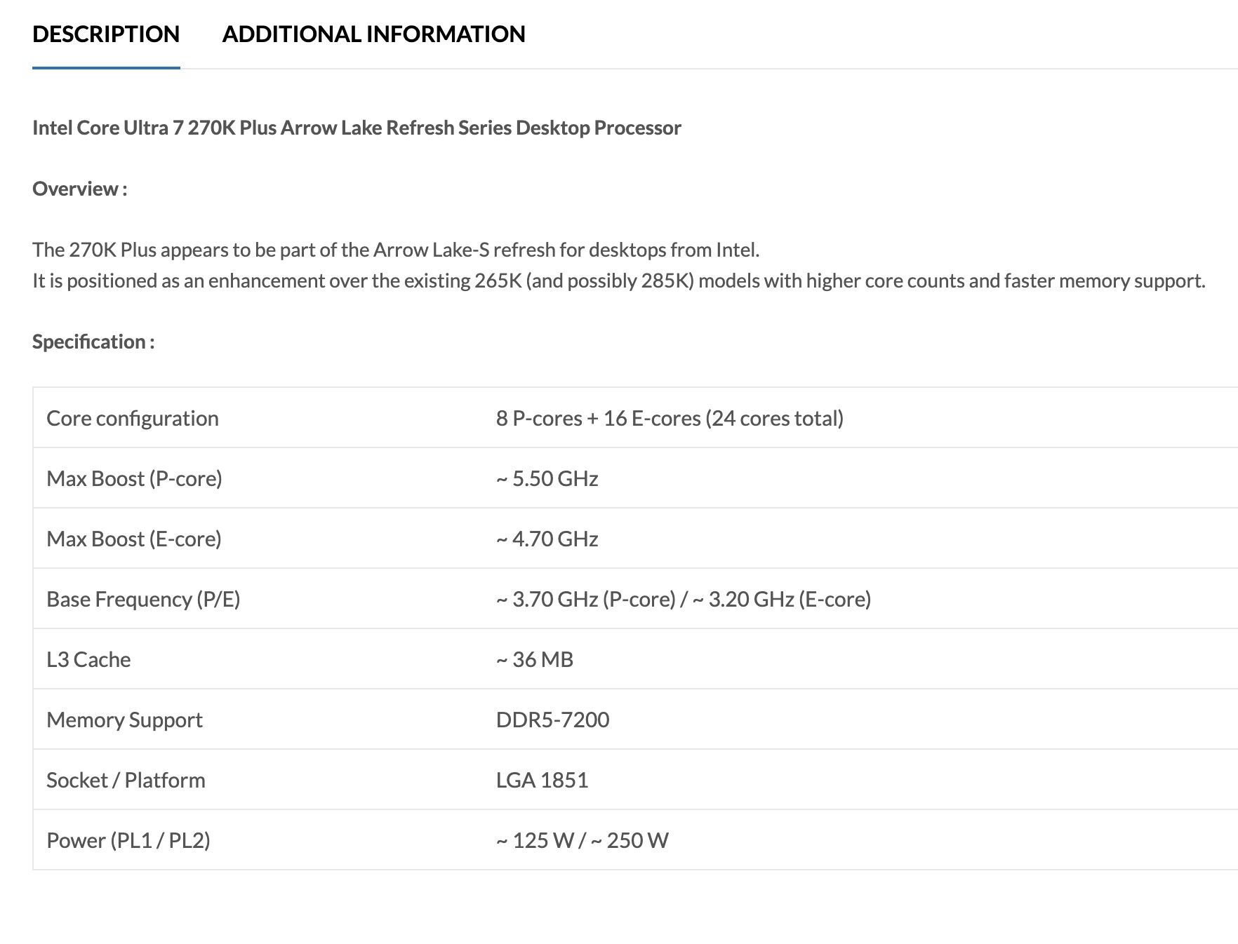 Identificado pelo informante @momomo_uso varejista de PCs indiano PrimeABGB listou tanto o Core Ultra 9 290K Plus e o Core Ultra 7 270K Plus em seu site, juntamente com as especificações de cada chip. Não há como verificar se as informações fornecidas estão corretas ou não, pois elas também podem ser apenas um espaço reservado para essas CPUs para jogos em desktops que estão prestes a ficar prontas.