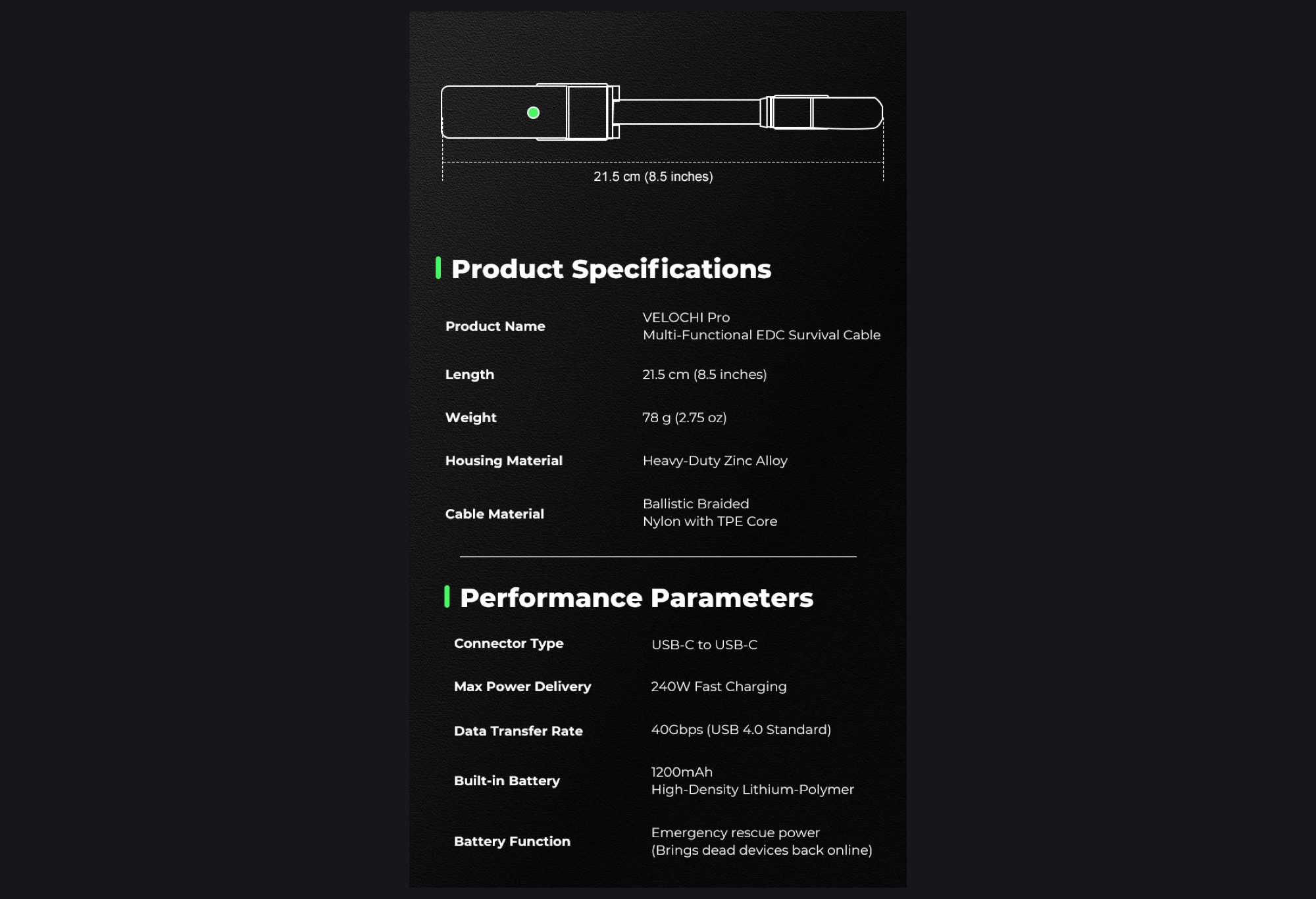 O Velochi Pro é comercializado como um gadget de transporte diário (EDC) para entusiastas de tecnologia. Enquanto muitas ferramentas EDC combinam ferramentas como facas, chaves de fenda ou abridores de pacotes, o coração do Velochi Pro é um cabo USB-C para USB-C que atinge taxas de dados de até 40 Gbit/s e pode carregar dispositivos com até 240 watts. Assim, o Velochi Pro compete com cabos USB-4 de alta qualidade(US$ 19,99 na Amazon).