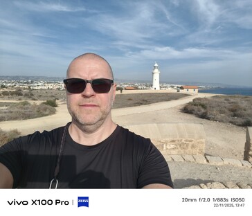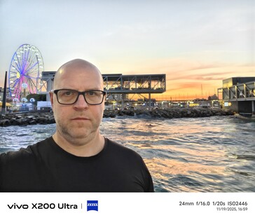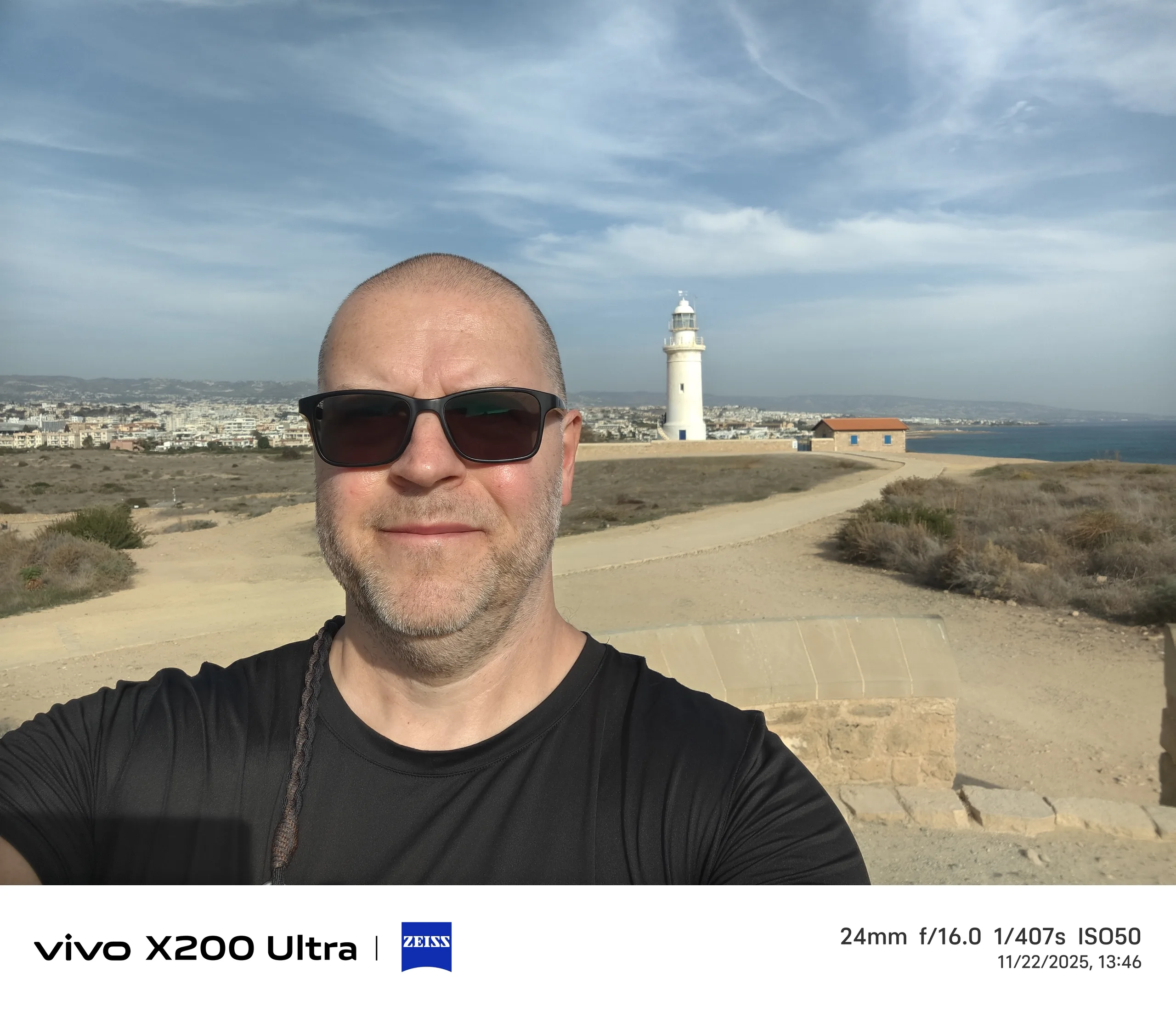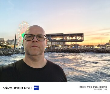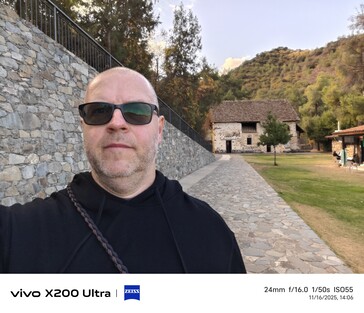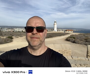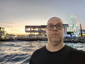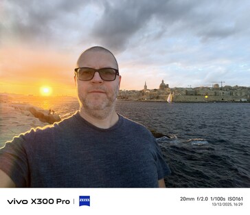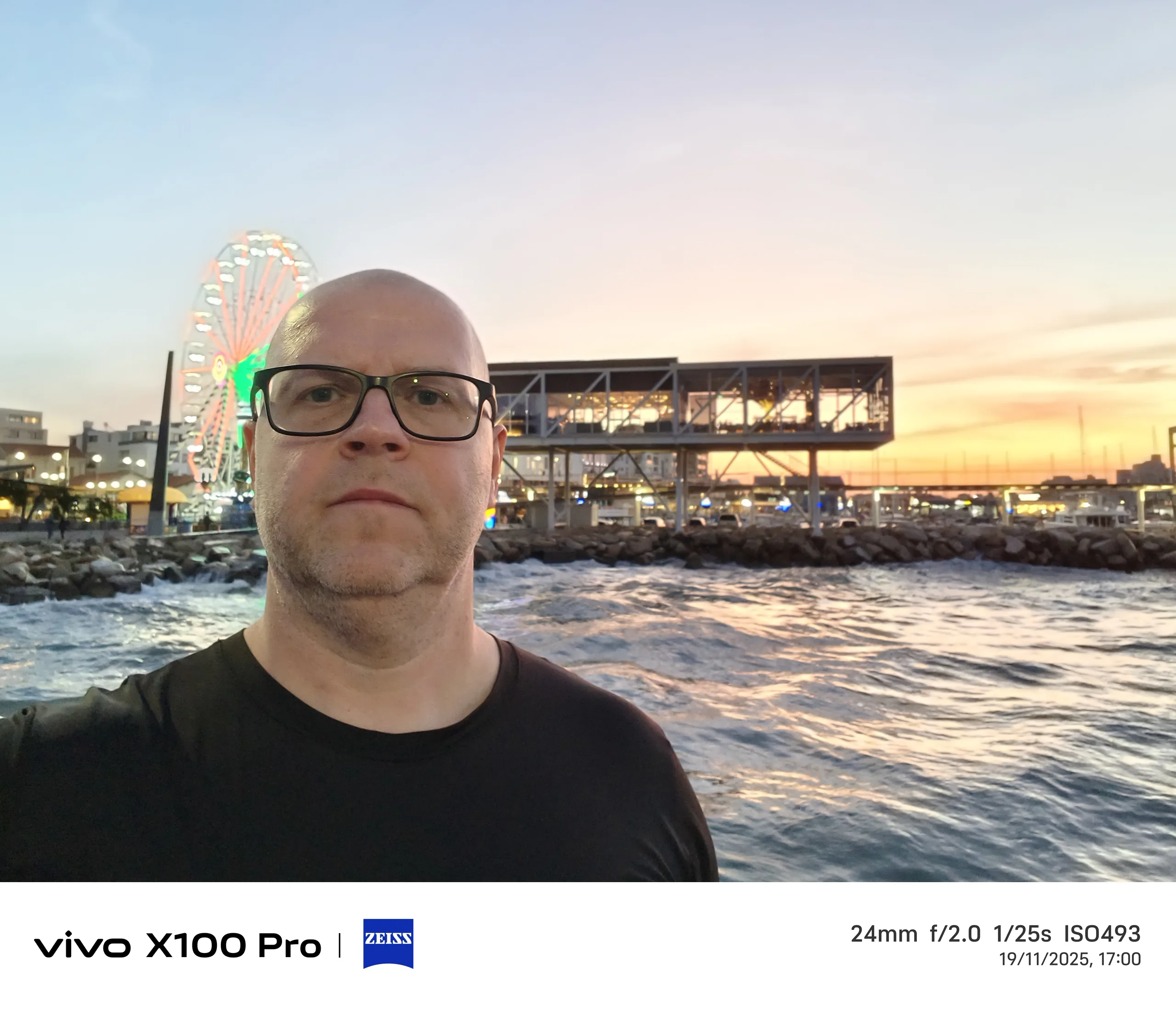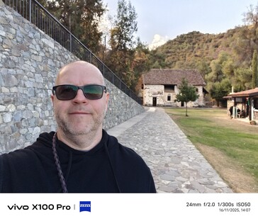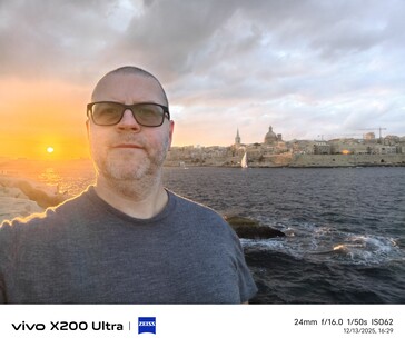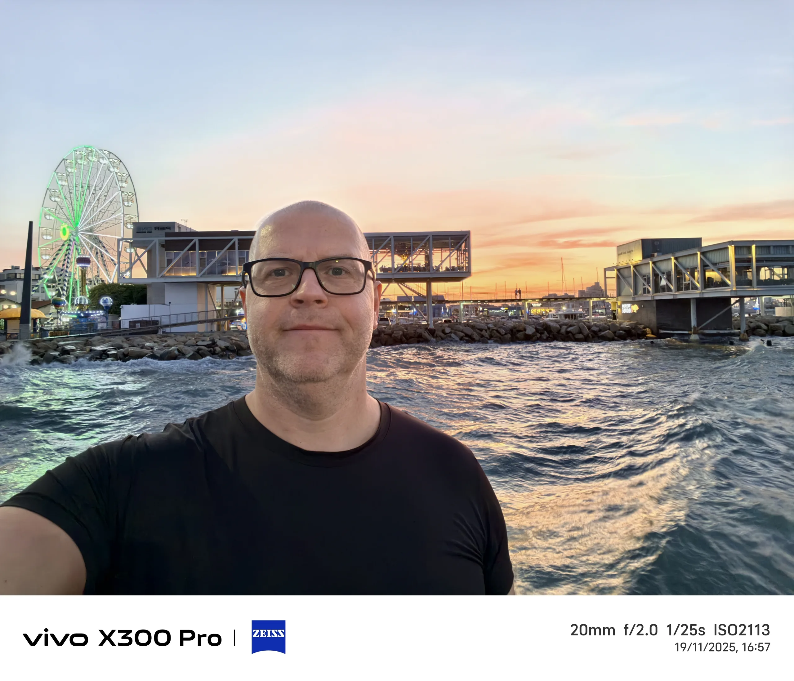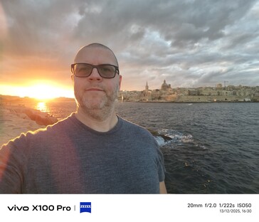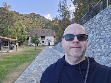 Não sou exatamente um grande fã de selfies, mas, no interesse da ciência, tirei algumas selfies em vários locais e sob diferentes condições de iluminação. Na minha opinião, o Vivo X300 Pro melhorou significativamente em termos de qualidade de selfie em comparação com o Vivo X200 Ultra. Na maioria dos casos, o mais recente carro-chefe da Vivo oferece a imagem mais natural do quarteto, não apenas graças ao seu campo de visão visivelmente mais amplo, mas também em termos de tons de pele - pelo menos no meu caso. No exemplo final, com o pôr do sol servindo como fonte de luz de fundo, no entanto, o Vivo X300 Pro também tem um pouco de dificuldade.