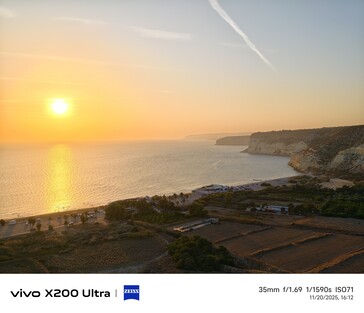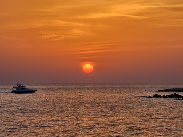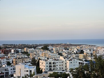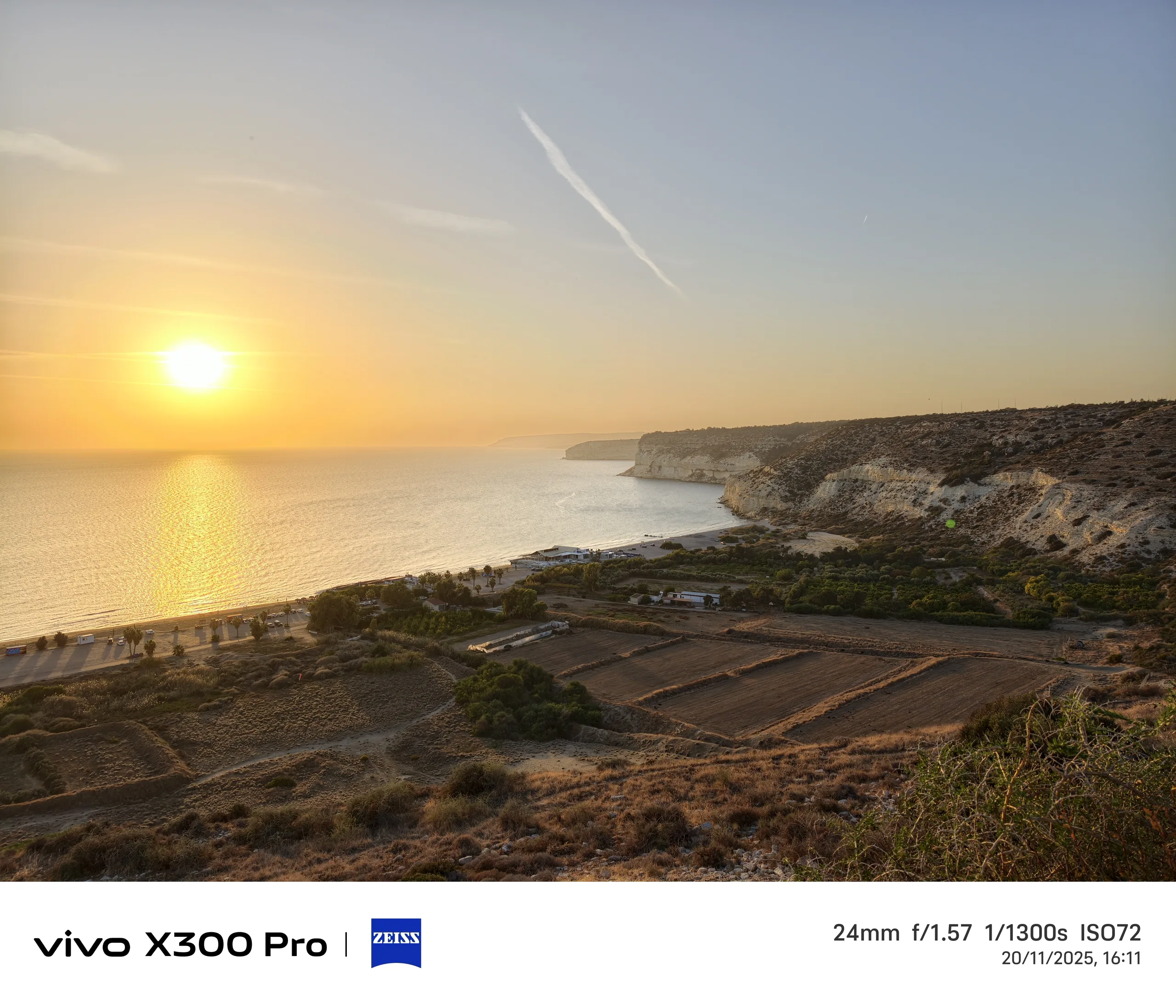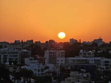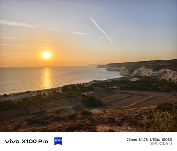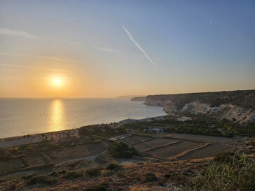 No segundo exemplo, voltamos a Kourion, olhando para o pôr do sol e para a praia de Kourion. O sensor de 1 polegada da Vivo X100 Pro oferece a representação mais colorida do pôr do sol, mas não necessariamente a mais precisa, pois o sol não estava tão vermelho no momento. Apesar de ter o maior sensor e a maior velocidade do obturador, essa foto também é a mais escura.