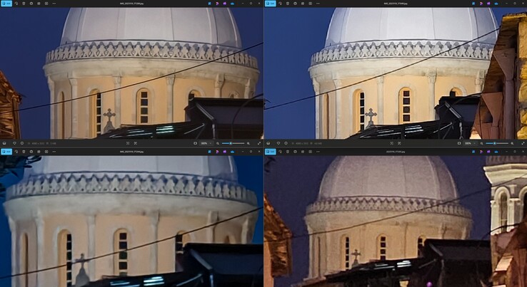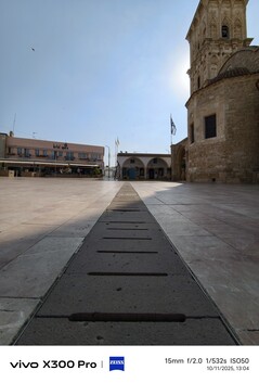 A Igreja de São Lázaro, em Larnaca, serviu como objeto de referência para a primeira comparação ultra grande angular entre os modelos da Vivo. Peço desculpas pelos ângulos de filmagem ligeiramente diferentes em cada caso, mas o vencedor deve ser bastante claro, independentemente disso. A Vivo X200 Ultra não só oferece o campo de visão mais amplo e é o único modelo capaz de capturar a igreja em sua totalidade, mas sua renderização de detalhes mais distantes também é claramente a mais nítida. Mesmo à luz do dia, ela é, portanto, a clara vencedora na ampliação de 300×, embora a Vivo X300 Pro ainda seja visivelmente melhor que a Vivo X100 Pro.