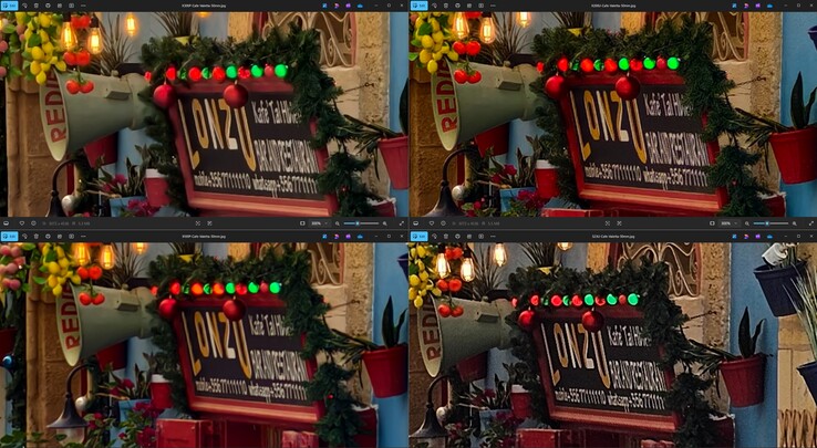 Em uma inspeção mais próxima, algumas diferenças se tornam aparentes nos detalhes. O zoom digital do Vivo X200 Ultra de 35 mm para 50 mm parece ser o mais fraco entre os modelos da Vivo. O texto é um pouco mais legível no Samsung, mas as luzes parecem excessivamente brancas. A câmera principal do Vivo X300 Pro preserva a maior parte dos detalhes sem parecer muito nítida, enquanto o X100 Pro claramente não se beneficia muito do seu sensor de 1 polegada em comparação e parece um pouco suave demais.