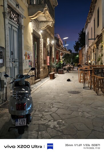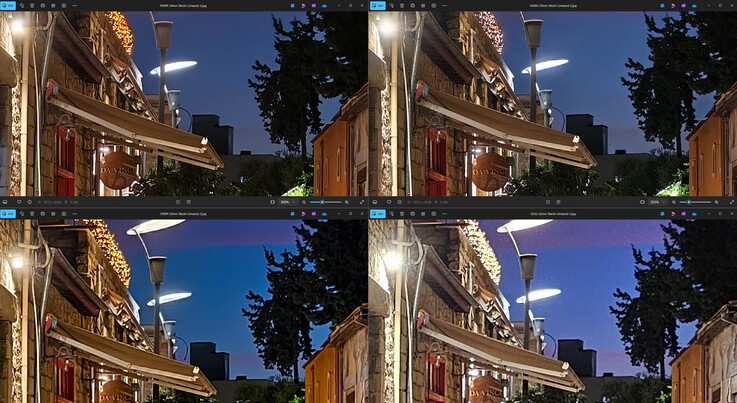 À primeira vista, as lâmpadas superexpostas da Galaxy S23 Ultra se destacam, enquanto os três modelos da Vivo mantêm os destaques sob controle muito melhor. A Vivo X200 Ultra mostra a maior quantidade de detalhes em objetos distantes, o que não é surpreendente, considerando sua distância focal de 35 mm. Em retrospectiva, esse resultado corrobora a mudança da Vivo em relação ao IMX989: apesar dos sensores menores, o Vivo X100 Pro não consegue acompanhar, mesmo a curta distância. Por exemplo, à esquerda da motocicleta, o Vivo X300 Pro mostra mais detalhes do que o X100 Pro e o X200 Ultra.