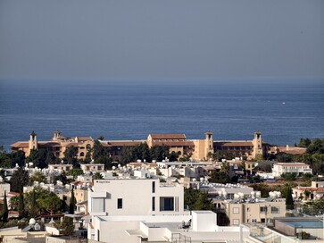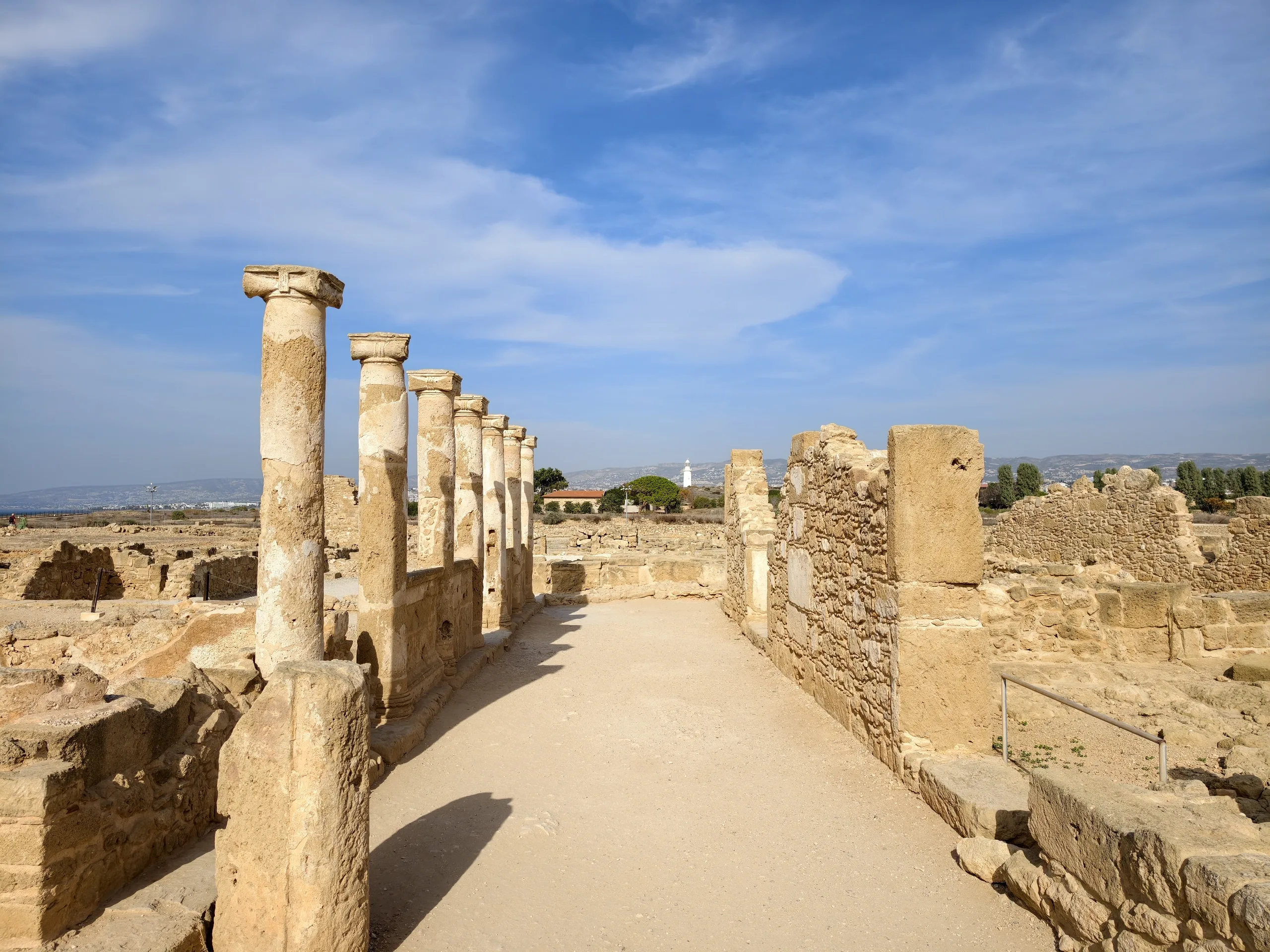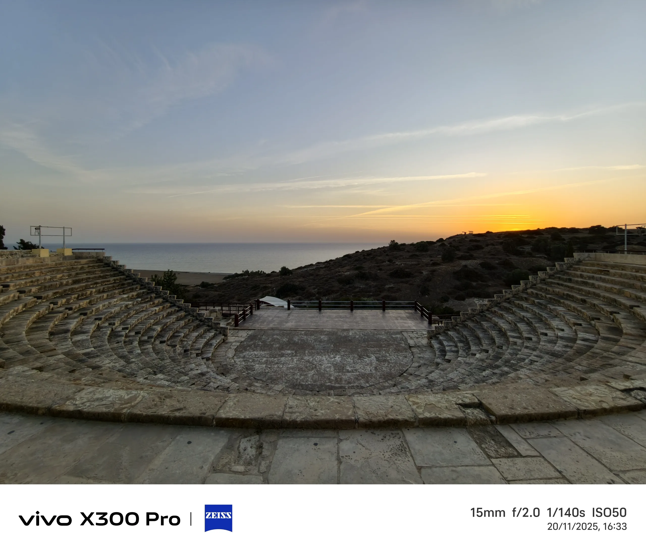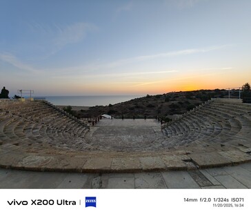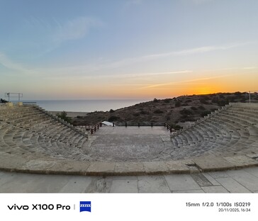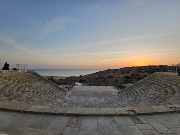 Para o segundo exemplo de ultra grande angular, nos deslocamos 81 quilômetros para Curium (Kourion), um antigo sítio arqueológico com uma excelente vista da área ao redor. Em novembro, geralmente não há muita coisa acontecendo aqui, então algumas partes do local podem parecer quase desertas, como o anfiteatro ao pôr do sol. Essa comparação também inclui o celular Samsung de 2023 na linha de ultra grande angular, mostrado no canto inferior direito de cada imagem.