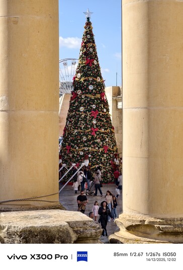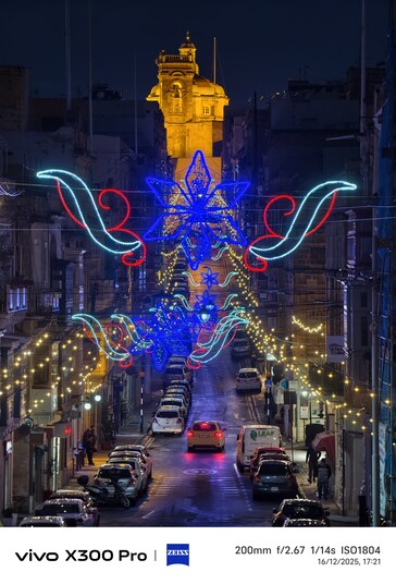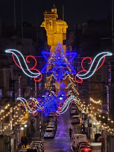 Malta antes do Natal é uma experiência especial. Em vez de neve, muitas partes da cidade apresentam ruas com iluminação de Natal, às vezes muito elaborada, o que também contribui para um bom teste de modo noturno com a câmera na mão - por exemplo, na Triq Il-Vitorja em Senglea ou ao longo da artéria principal de Valletta, que estava lotada à noite. Essas são condições bastante desafiadoras para um teste de zoom de 10x. Com um tripé, é claro que teria sido possível obter resultados significativamente melhores.