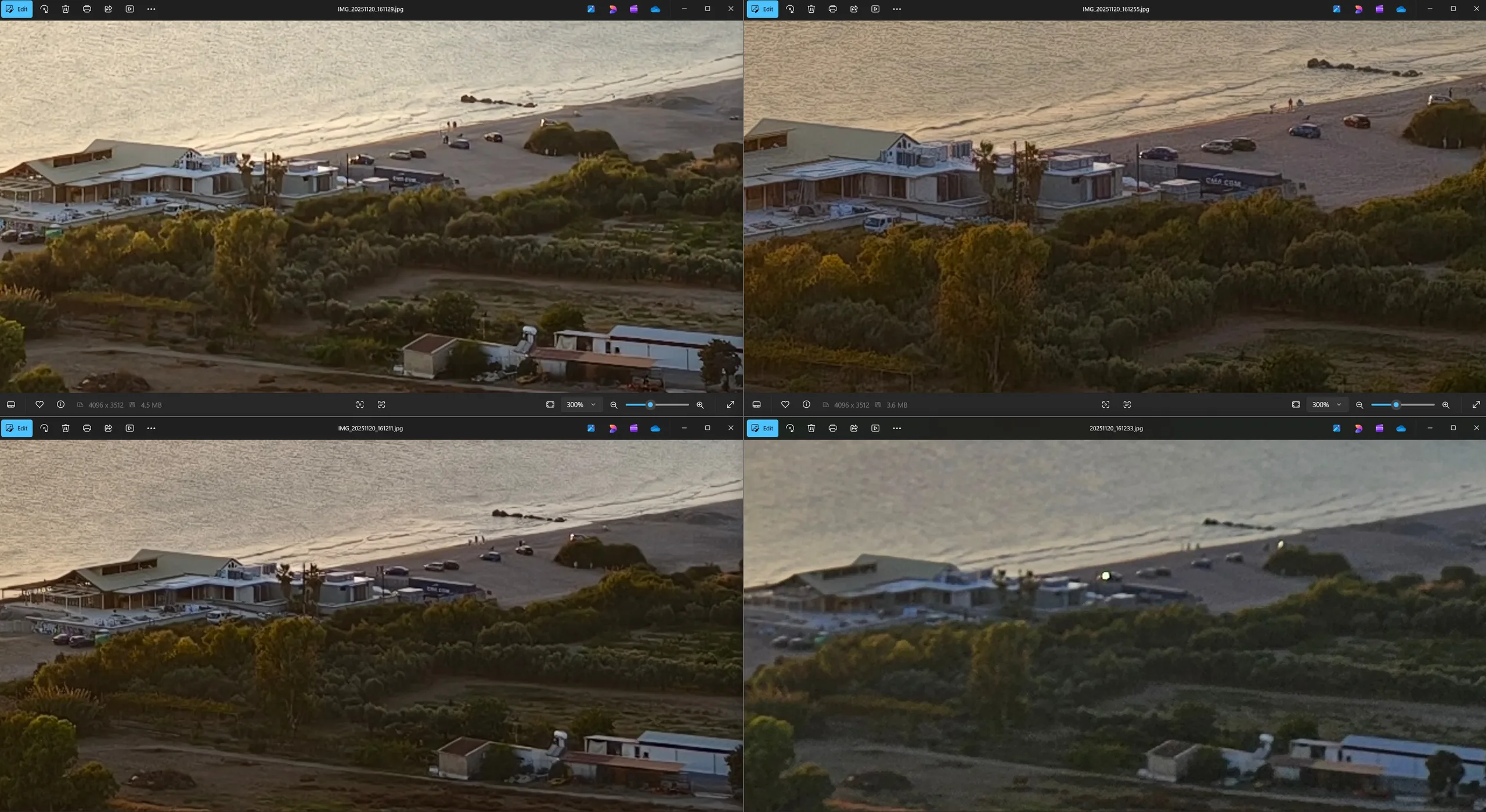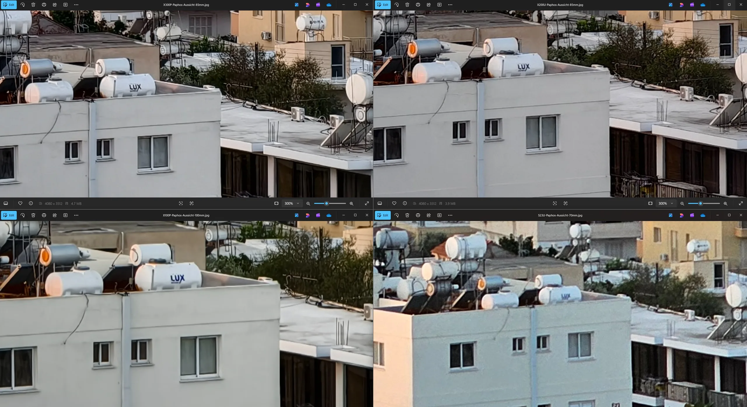 Em todas as três comparações, há uma clara diferença na nitidez e no nível de detalhes entre o Samsung Galaxy S23 Ultra e o Vivo X100 Pro, por um lado, e o Vivo X200 Ultra e o Vivo X300 Pro, por outro. Os dois últimos estão, em geral, em um nível muito semelhante e diferem principalmente nos detalhes mais finos, como cores um pouco mais fortes ou um pouco mais de contraste no modelo Pro mais recente.