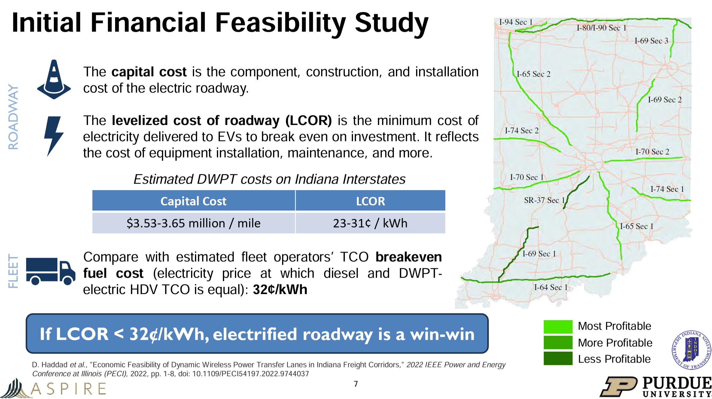 O teste bem-sucedido mostrou que carregar caminhões elétricos como o Tesla Semi em movimento é um empreendimento viável que permitiria aos fabricantes de automóveis reduzir o tamanho da bateria, a parte mais cara de um veículo elétrico. De acordo com o Departamento de Transportes de Indiana, o custo de equilíbrio do preço do diesel e da eletricidade para a estrada de carregamento dinâmico é de 32¢/kWh, enquanto os custos operacionais de seu sistema de teste são de 23-31¢/kWh, de modo que eles consideram a rodovia indutiva um cenário vantajoso para todos, pelo menos em Indiana.
