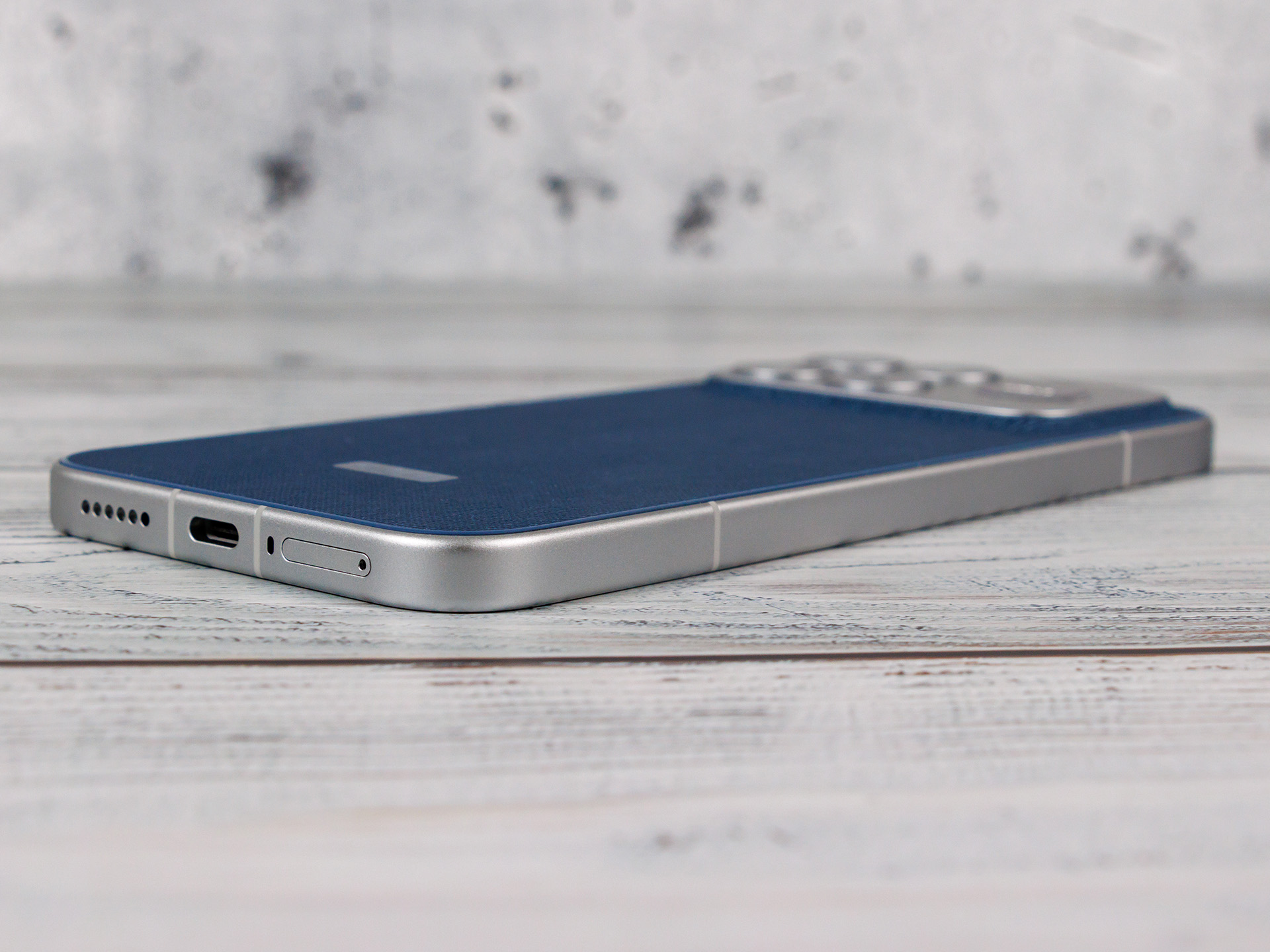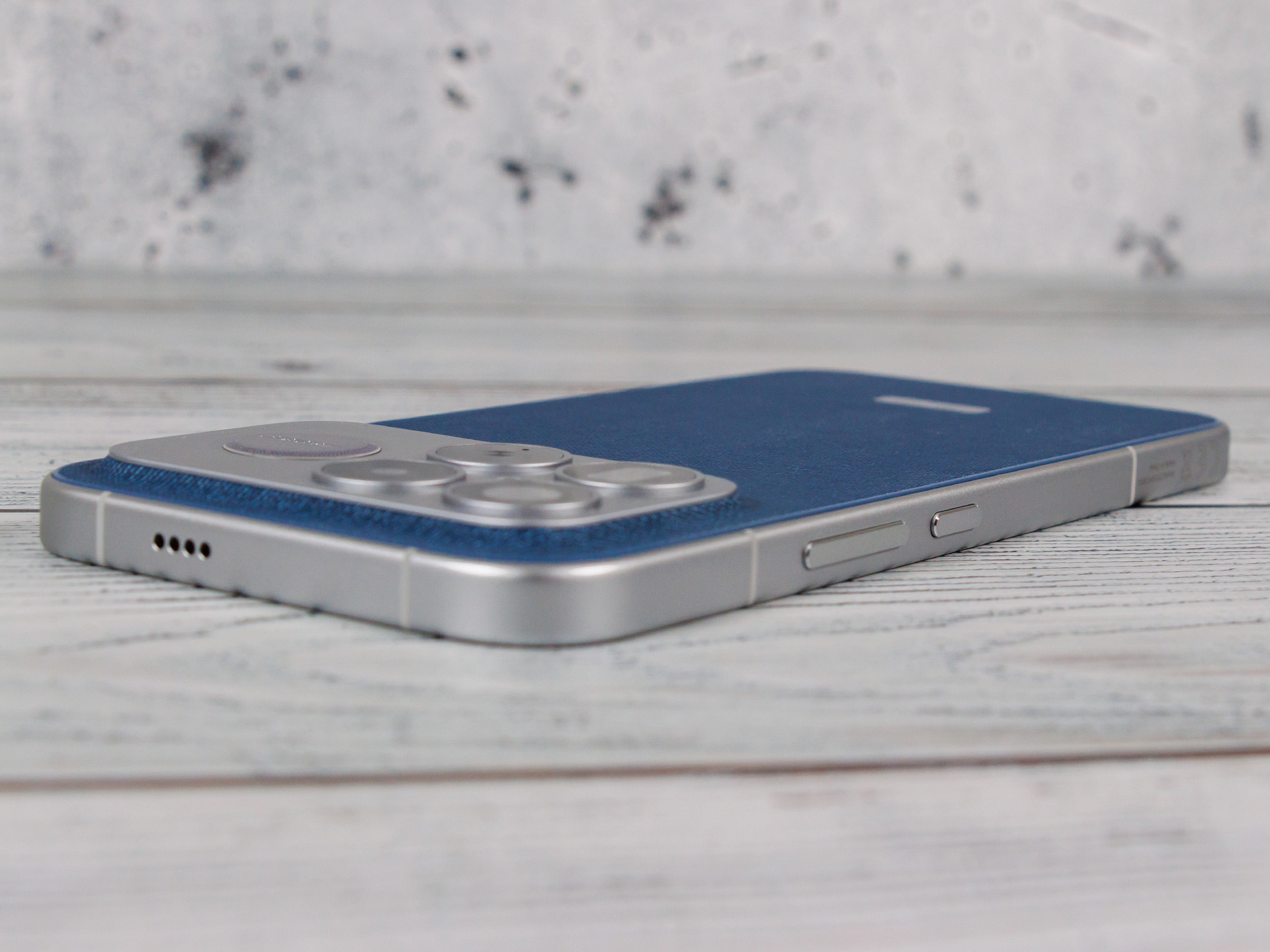 O Poco F8 Ultra está disponível nas variantes de cor Preto e Azul Denim. No modelo preto, a moldura é preta fosca e o painel traseiro é feito de um composto de fibra de vidro. A versão azul, por outro lado, usa um nanomaterial à base de resina de silicone projetado para imitar a aparência de jeans, combinado com uma estrutura de alumínio prata fosco. O chassi tem uma espessura nominal de 8,3 mm, o que pudemos confirmar. Incluindo o módulo da câmera, a espessura aumenta para 11,9 mm.