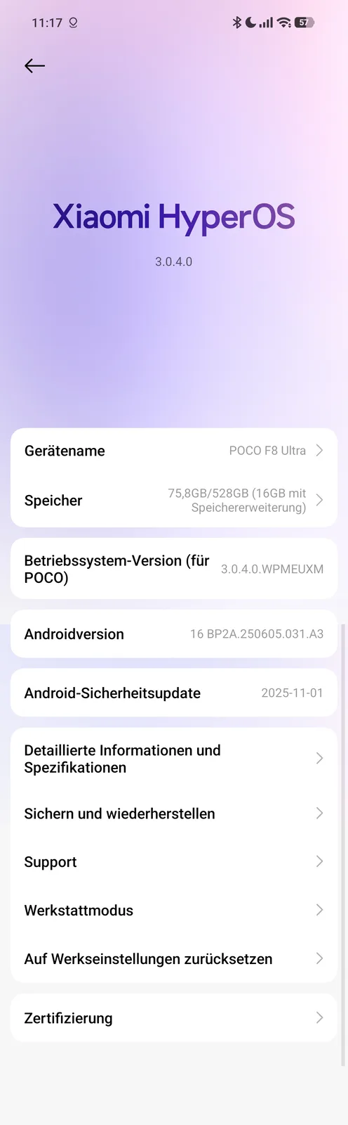O Poco F8 Ultra vem com o Google Android 16 e o HyperOS 3.0 da Xiaomi. De acordo com o fabricante, ele está preparado para receber quatro anos de atualizações da versão Android e mais dois anos de patches de segurança. Considerando as ambições de alto nível do dispositivo, seria desejável um suporte de software mais longo.