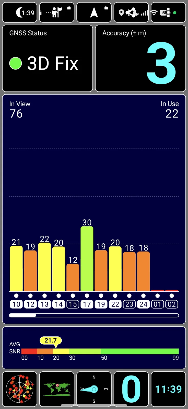 O travamento do satélite foi obtido muito rapidamente em ambientes externos. Em ambientes internos, a aquisição demorou um pouco mais, mas permaneceu comparativamente rápida.