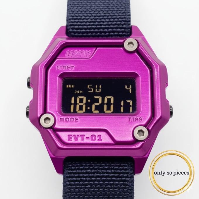 A campanha do EVT-01 no Kickstarter tem vários níveis de recompensa, todos limitados em quantidade e enviados globalmente a partir de março de 2026. As opções para os madrugadores incluem pacotes de relógios simples e duplos, com preços que variam de € 220 (~$ 257) para os primeiros apoiadores até € 300 (~$ 350) para a edição "Glossy Violet" exclusiva do Kickstarter. Cada relógio apresenta uma caixa de alumínio anodizado usinado em CNC, cristal de safira, 100 metros de resistência à água e o movimento Casio F-91W. As quantidades para as edições especiais são baixas - uma tiragem violeta é limitada a apenas 20 unidades, enquanto as variantes cinza e bronze vêm em edições de 30 ou 50 por versão. Cada relógio é entregue com uma garantia de dois anos e pelo menos uma pulseira extra.
