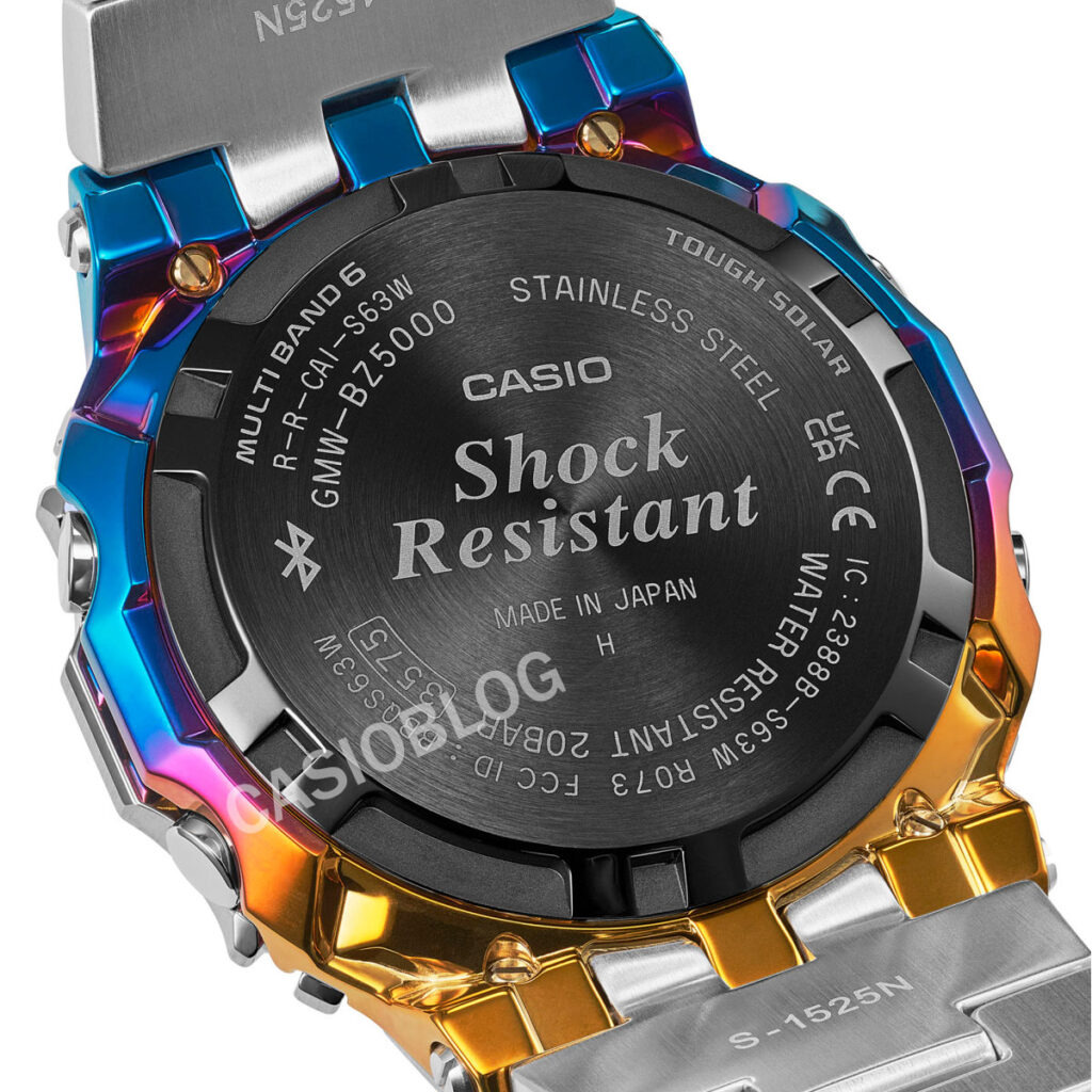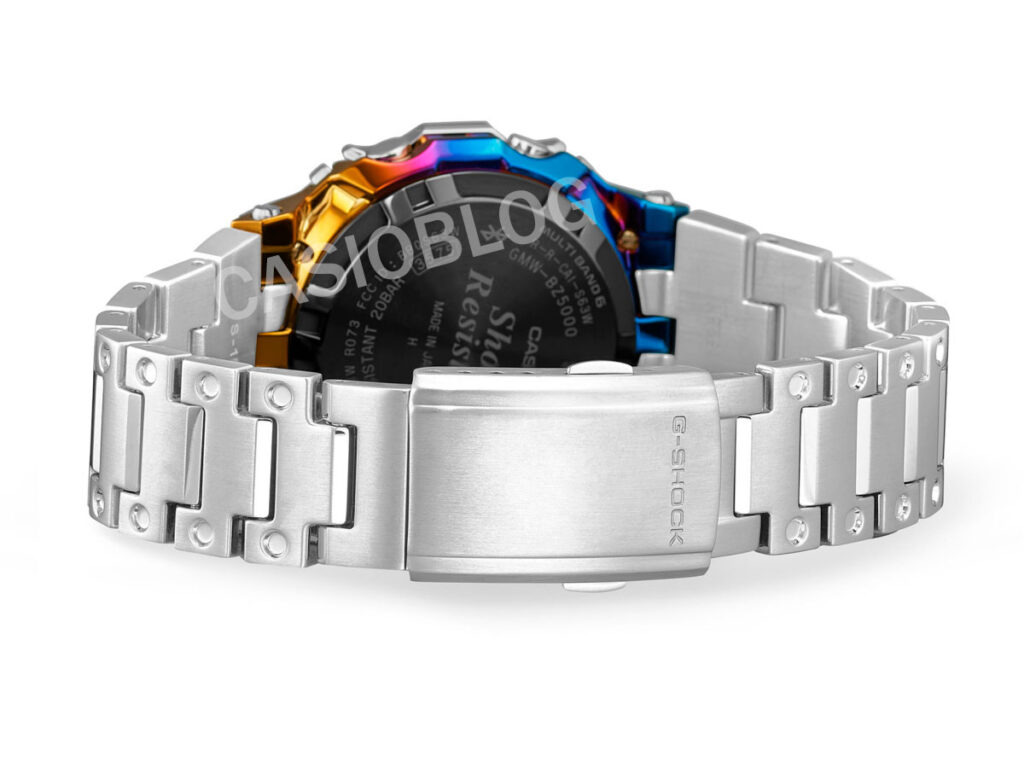 As renderizações atualizadas superclaras mostram como a Casio está lidando com o acabamento banhado a íons do arco-íris com mais detalhes. Em vez de uma caixa totalmente colorida, os acentos são aplicados seletivamente nas bordas estruturais da caixa, especialmente ao longo dos segmentos inferior e lateral. Os tons azul e roxo são mais proeminentes na metade inferior. Isso se transforma em tons dourados e alaranjados mais quentes perto das alças superiores e das juntas do bezel.