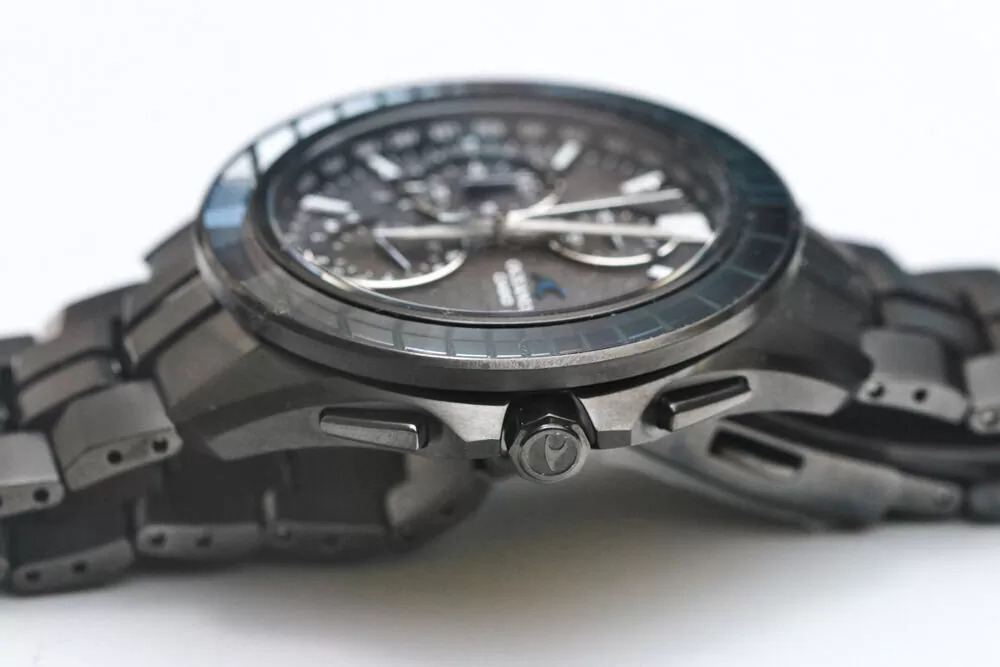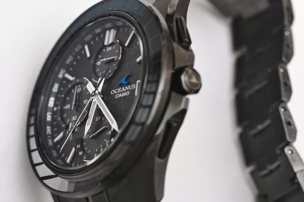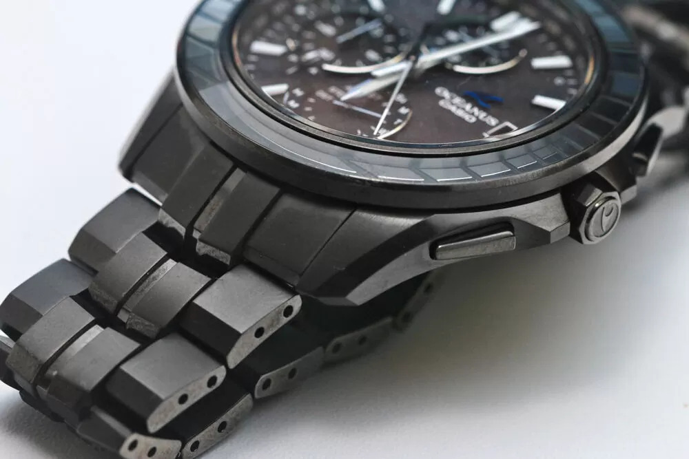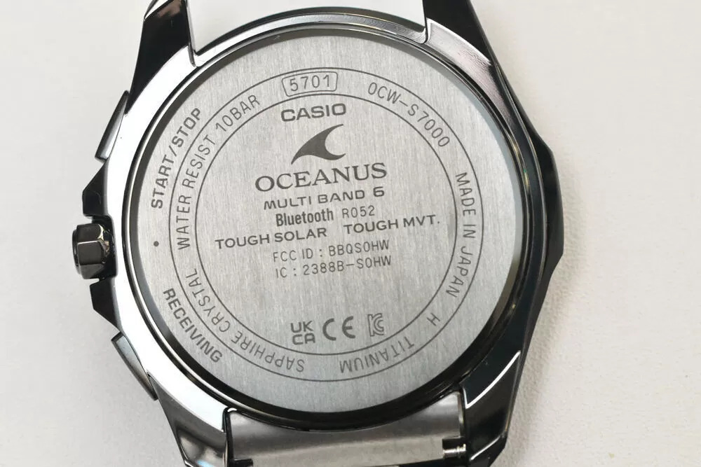 As fotos de perfil lateral mostram uma caixa relativamente fina, considerando a lista de recursos, e o formato da alça parece que deve ser usado confortavelmente. Os botões e a coroa têm uma construção limpa e angular, e a coroa tem um símbolo Oceanus gravado. O verso da caixa mostra Bluetooth, sincronização de rádio Multiband 6, Tough Solar, cristal de safira e resistência à água de 10 bar.
