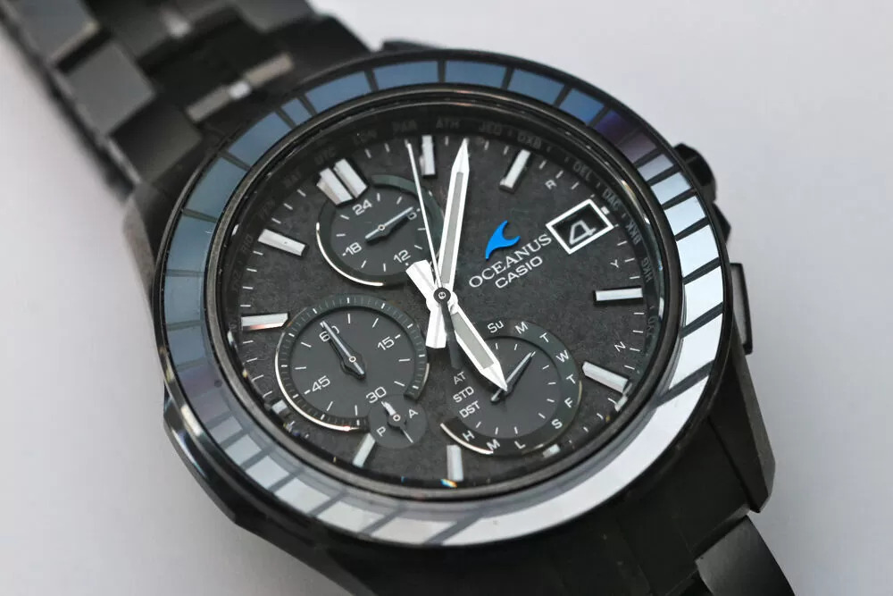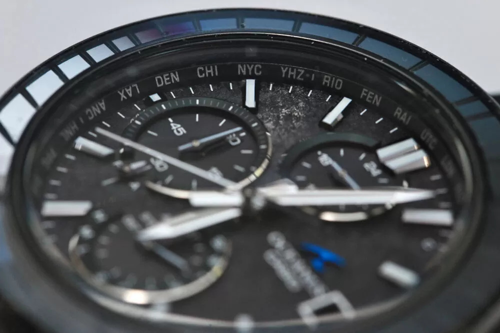 O mostrador também é mais interessante nessas fotos reais. Em vez de parecer plana e uniforme, a superfície tem uma aparência texturizada, quase de pedra, que se altera sob a luz. Os submostradores e marcadores se destacam mais claramente, e a janela de data emoldurada às quatro horas parece muito mais refinada ao vivo. O logotipo azul brilhante da onda Oceanus é impressionante contra o fundo preto - muito mais perceptível do que nas imagens originais da imprensa.