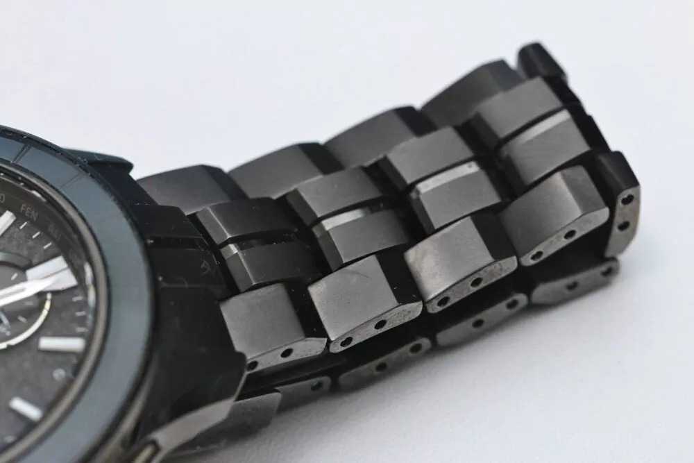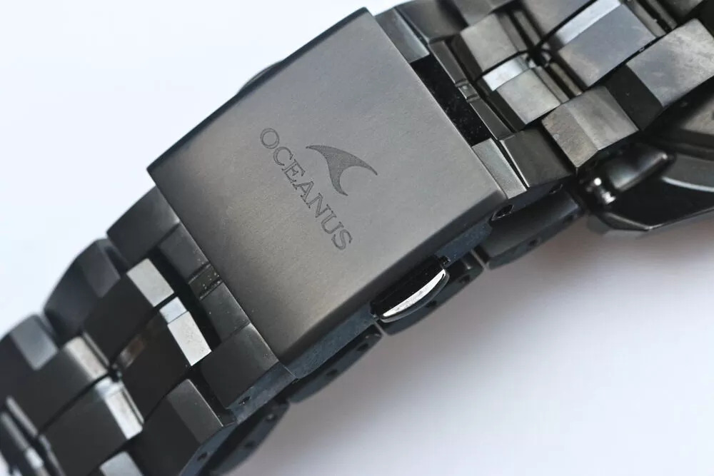 A primeira coisa que chama a atenção é a caixa e a pulseira. O relógio parece usar uma construção totalmente em titânio com acabamento em DLC preto, e os closes mostram bordas mais nítidas e usinagem mais complexa do que o normal. Os elos da pulseira têm facetas visivelmente angulares, e a escovação parece profunda em vez de levemente pintada. A foto do fecho também mostra um logotipo Oceanus muito bem gravado, com uma textura fosca que complementa o polimento reflexivo ao redor.