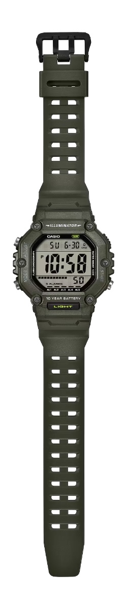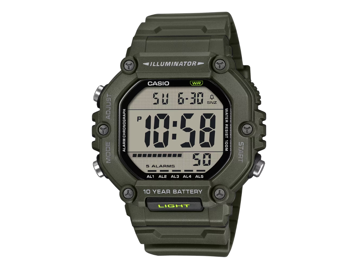 O AE-1600 da Casio é um relógio de horário duplo, com ferramentas como cronômetro, cronômetro de contagem regressiva e cinco alarmes diários. O mostrador digital pode ser iluminado com uma luz de fundo de LED âmbar com o apertar de um botão. Outros recursos notáveis incluem resistência à água de 100 m e uma vida útil de 10 anos da bateria CR2032.