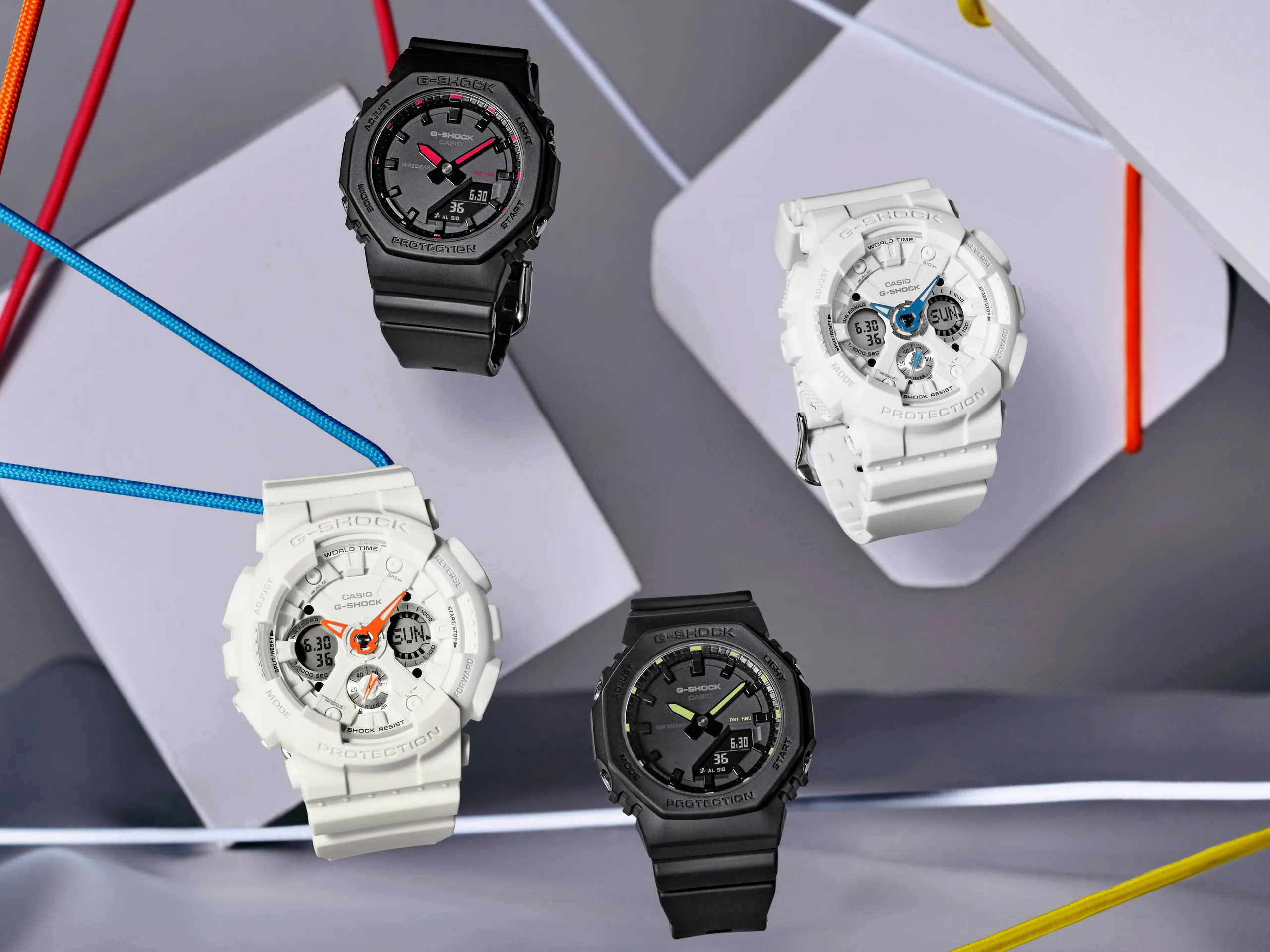 O GMA-S120SA também é um relógio híbrido, embora apresente dois mostradores digitais menores e um mostrador indicador. Esse modelo suporta 29 fusos horários mundiais com uma função Home City e é antimagnético. Aqui, os recursos incluem um cronômetro de 1/1000 de segundo, um timer de contagem regressiva, cinco alarmes e uma luz de fundo de LED âmbar. Ambos são relógios totalmente brancos com uma moldura redonda robusta. Os únicos elementos não brancos são os ponteiros do relógio e o indicador do mostrador, que são laranja no GMA-S120SA-7A1 e azul no GMA-S120SA-7A2.
