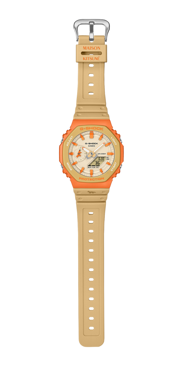 O Casio G-Shock GA-2110MK-5A tem uma paleta camaieu, ou monocromática, que se diz ter sido inspirada na arquitetura parisiense de Haussmann. O design gira em torno do motivo da raposa da Maison Kitsuné, que pode ser encontrado no submostrador do dia da semana. O bezel do relógio e vários detalhes no mostrador mais claro estão em um laranja brilhante combinando. O relógio de resina mede 48,5 x 45,4 x 11,8 mm (~1,91 x 1,79 x 0,46 polegadas), com um marcante bezel laranja, e a pulseira apresenta o logotipo da Maison Kitsuné.