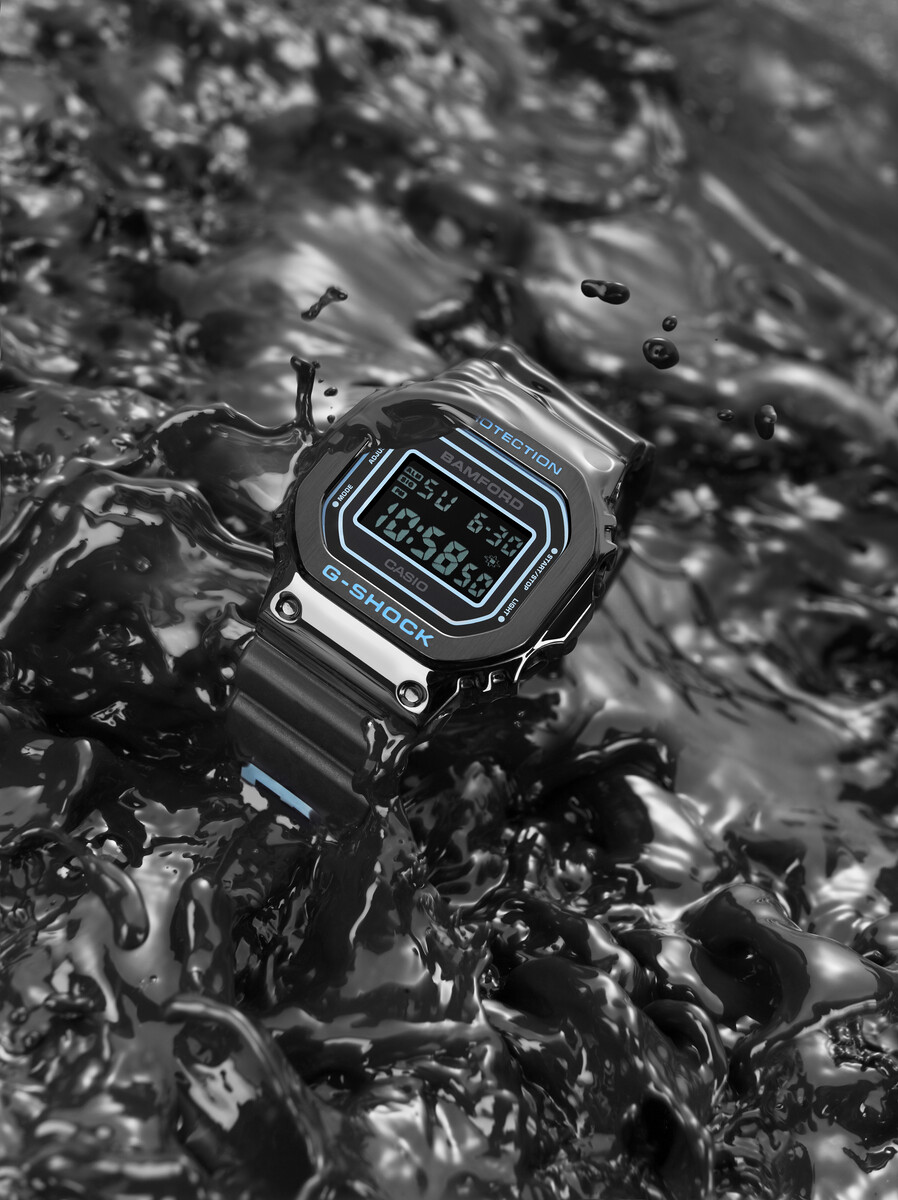 Embora o anúncio original tenha se concentrado no básico - um acabamento preto polido, LCD negativo e os detalhes em azul claro, marca registrada de Bamford - essas novas imagens nos dão uma noção um pouco melhor da personalidade do relógio. Uma foto dramática do produto coloca o GM-5600 em um líquido preto espesso. Outra foto captura o relógio aparentemente derretendo ou pingando, exibindo o brilho de seu exterior lustroso. Ambas as imagens mostram o contraste estético entre a marca Bamford fosca na pulseira e a caixa de metal polido.