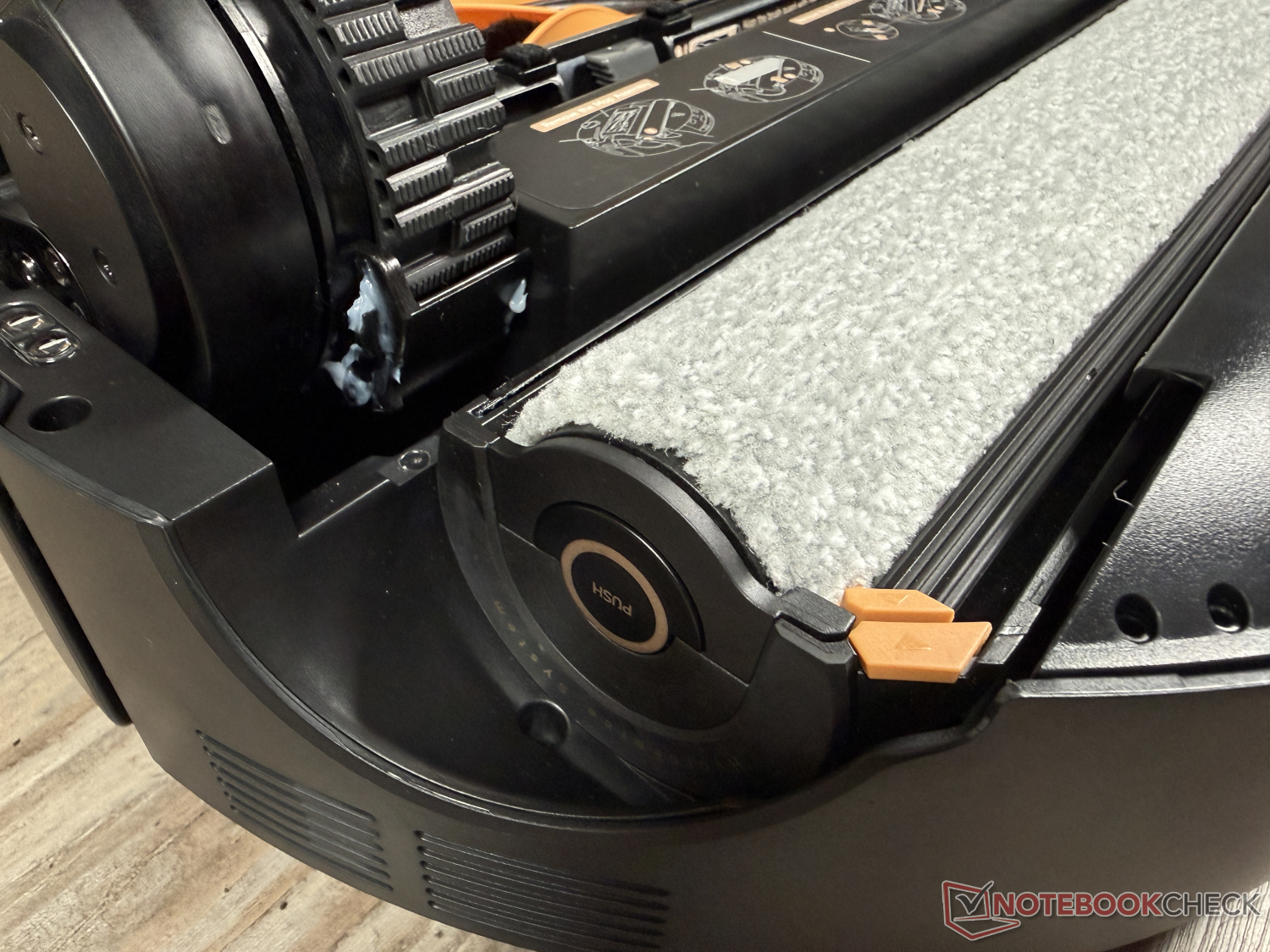 O que também é idêntico é que ambos os aspiradores de pó robóticos usam um rolo de esfregar largo para esfregar. A tecnologia é chamada de Mova HydroForce mopping e enxágua constantemente o rolo de esfregão, que foi previamente liberado da água suja, com jatos de água fresca de doze bicos. Com 4.100 Pa, a pressão de contato é um pouco menor do que com o Dreame. No entanto, o escudo protetor que cobre o rolo do esfregão ao limpar carpetes também está presente aqui.