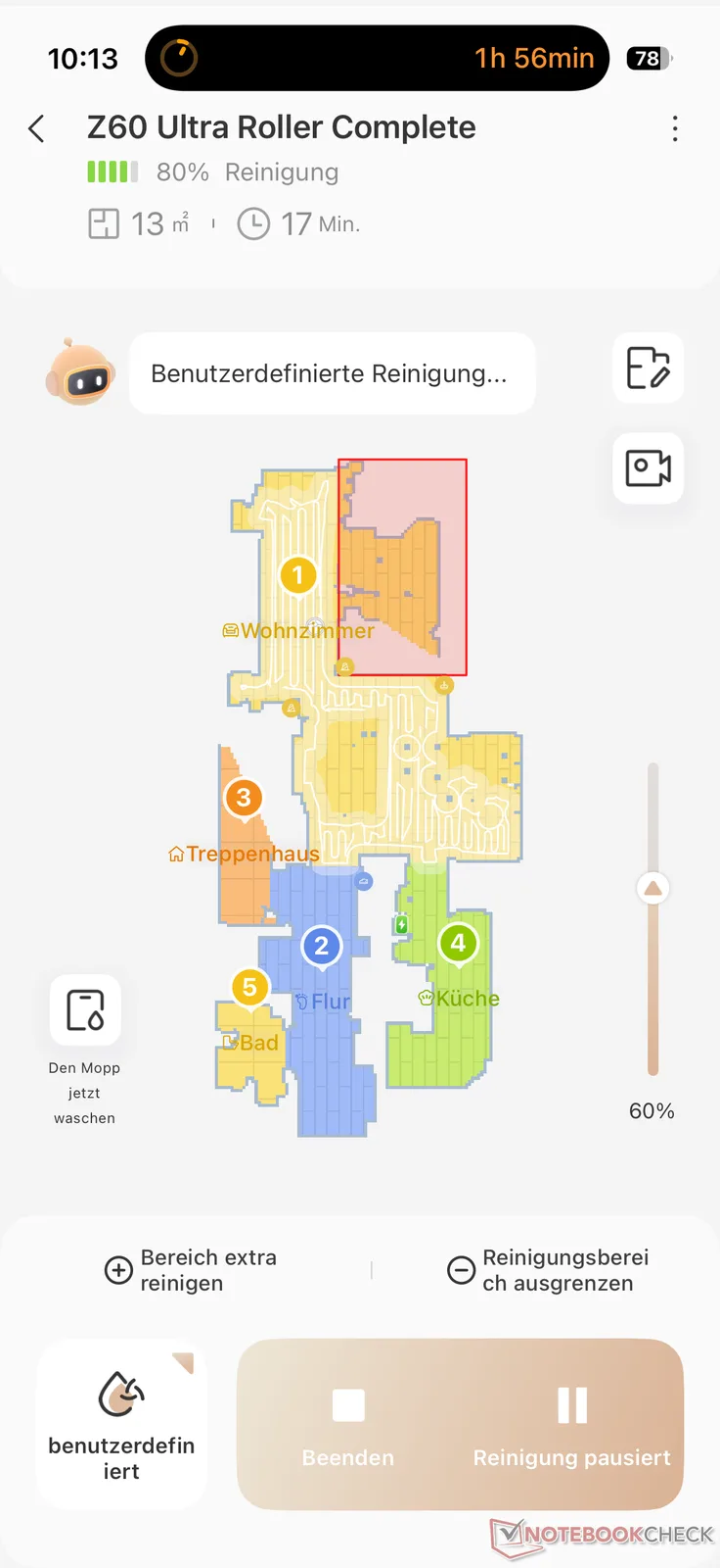 O Mova Z60 Ultra Roller Complete causou uma impressão muito boa em nosso teste. De acordo com a folha de dados, ele é um pouco mais fraco do que o Dreame Aqua10 Ultra Roller Complete, mas isso não é perceptível na prática. Todas as tecnologias importantes estão incorporadas em ambos os dispositivos e fazem um excelente trabalho.