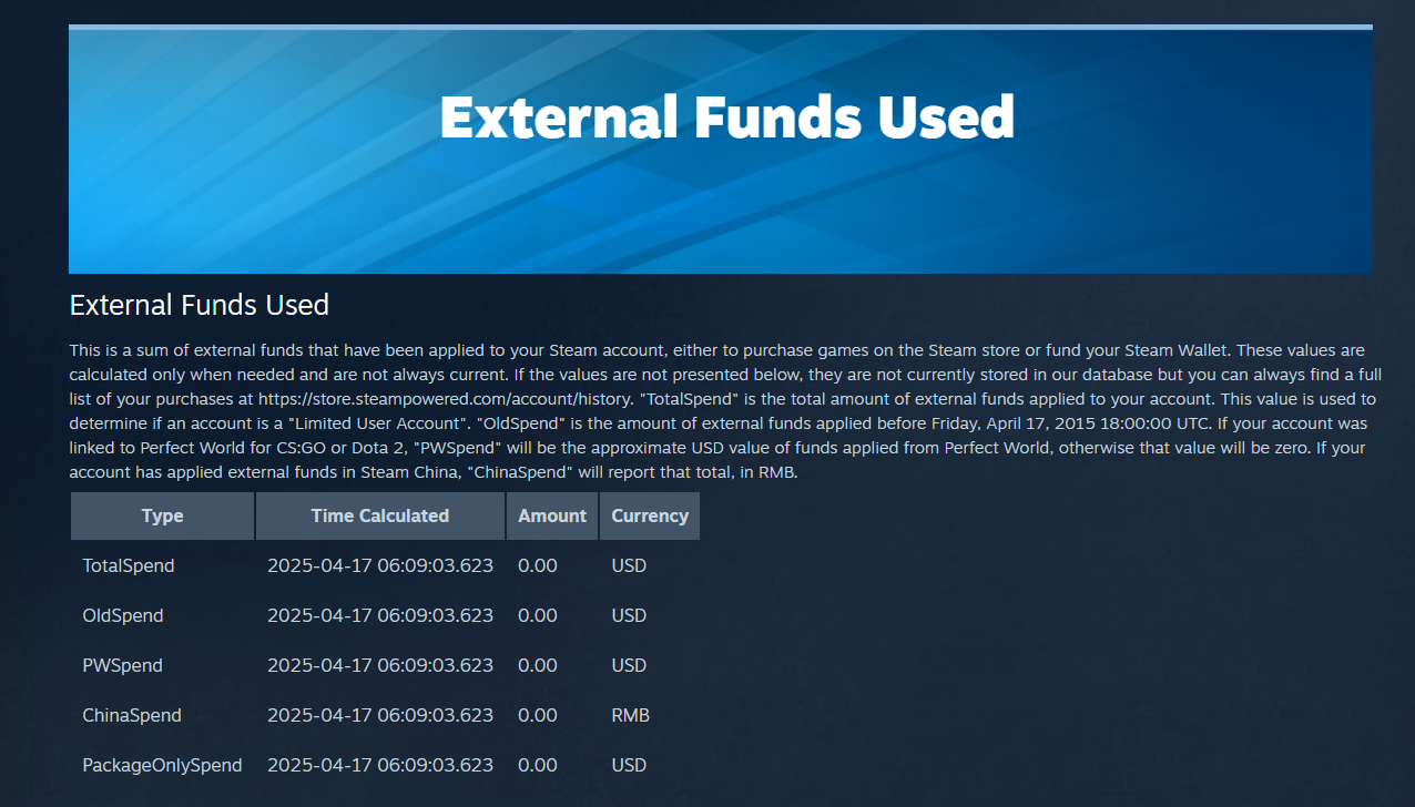 Há também o PWSpend para compras no Perfect World (relevante para jogadores de CS:GO ou Dota 2 em determinadas regiões), o ChinaSpend para transações no Steam China e o PackageOnlySpend para compras de jogos não transferíveis.