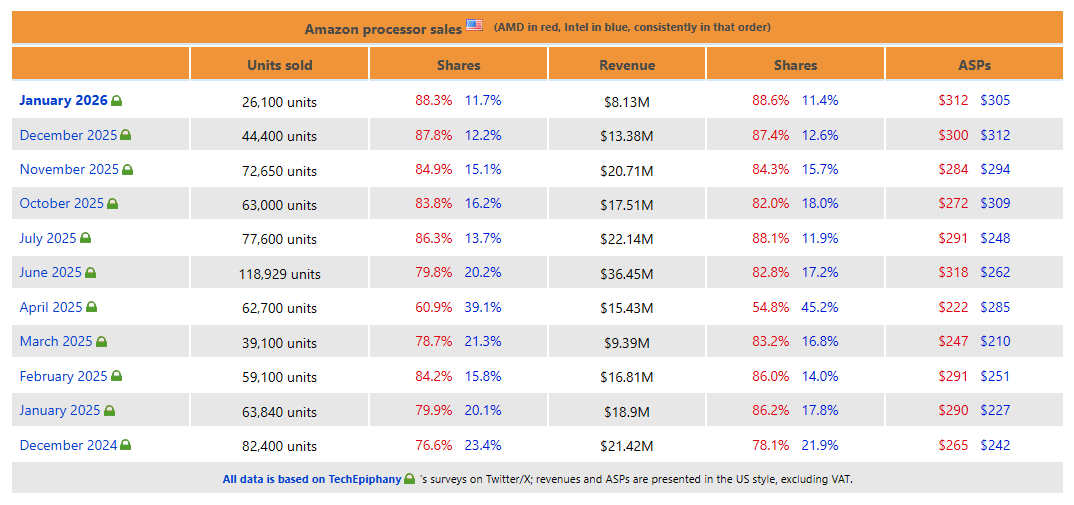 Com base no relatório da TechEpiphany3DCenter montou uma bela tabela mostrando os dados de vendas de CPU da Amazon US de dezembro de 2024 a janeiro de 2026. Houve um declínio impressionante de 51% nas vendas de CPU em janeiro de 2026 em relação a janeiro de 2025. No mesmo período, o preço médio de venda (ASP) aumentou 34,4%, passando de US$ 227 em janeiro de 2025 para US$ 305 em janeiro de 2026.