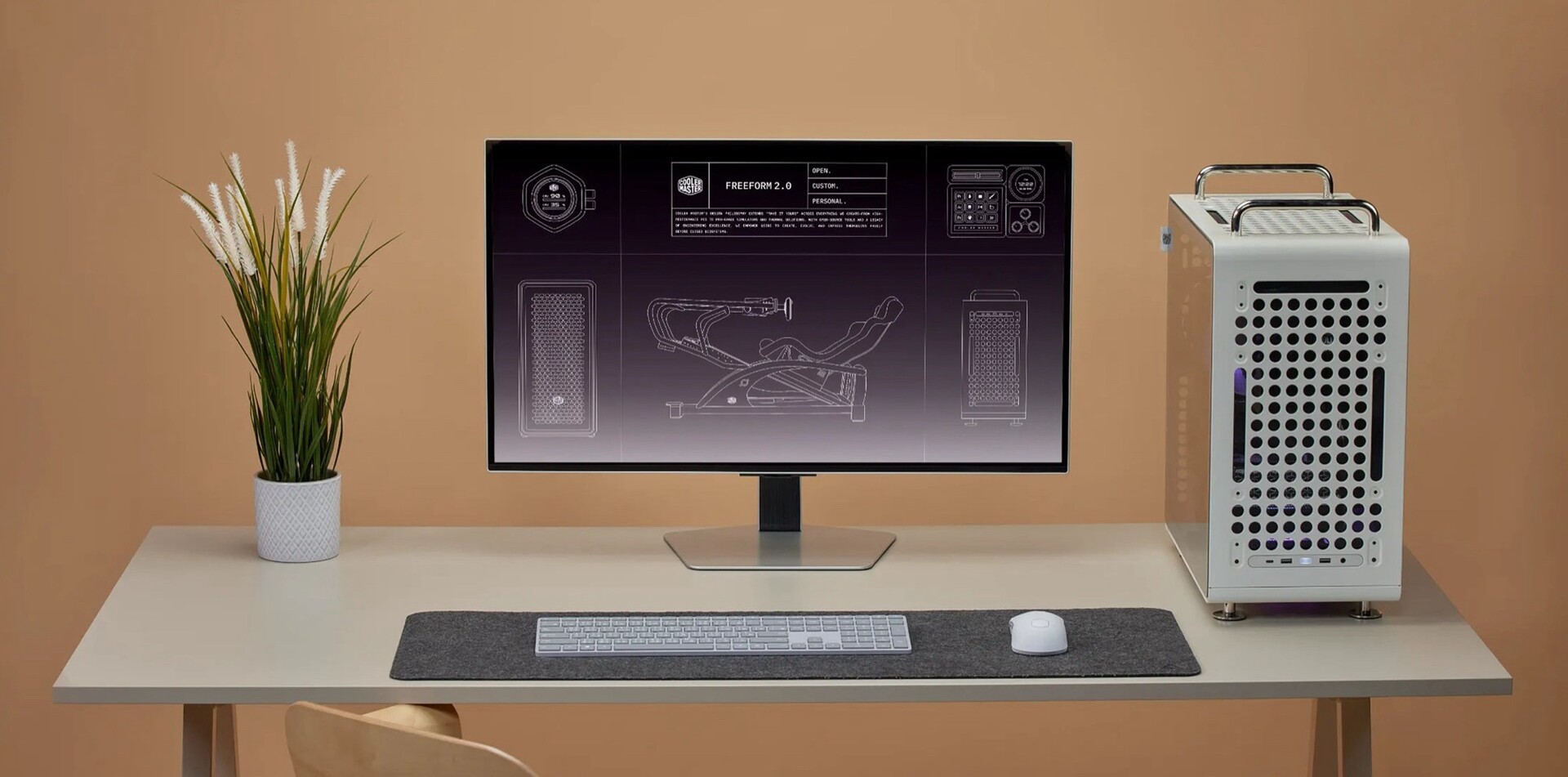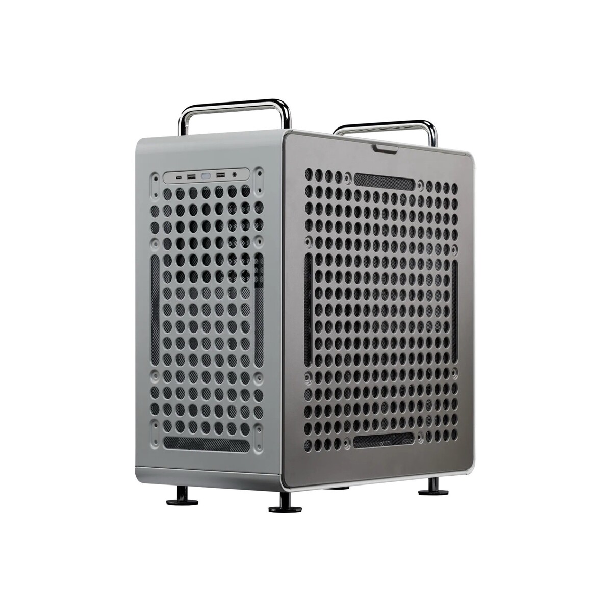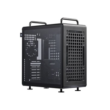O novo Cooler Master QUBE 540 é anunciado como um gabinete de PC altamente versátil com um preço relativamente baixo. Suas dimensões de 42,5 x 42,5 x 22,5 cm o tornam compatível com placas-mãe nos formatos ITX a E-ATX, bem como com placas gráficas de até 41,5 cm de comprimento. As grandes aberturas circulares na parte frontal e traseira podem ser usadas para fixar acessórios diretamente no gabinete.