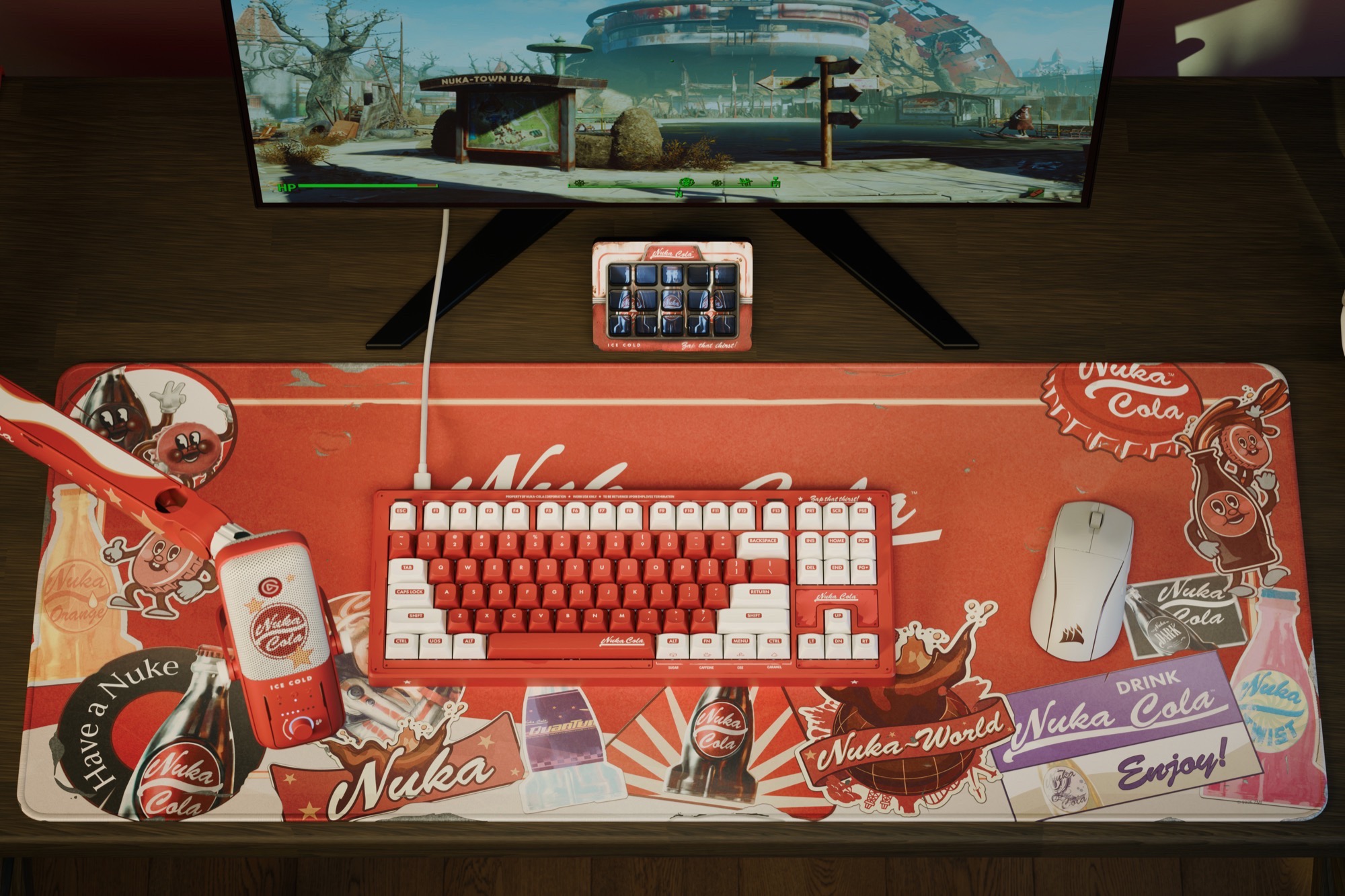 A Corsair fez uma parceria com a Bethesda para lançar uma linha completa de periféricos para jogos inspirada no design icônico da Nuka Cola, a bebida mais popular do universo Fallout. A coleção apresenta uma estética retro-futurista, com um esquema de cores vermelho e branco, estrelas amarelas, blocos de cores ousados e o elegante logotipo da Nuka Cola.