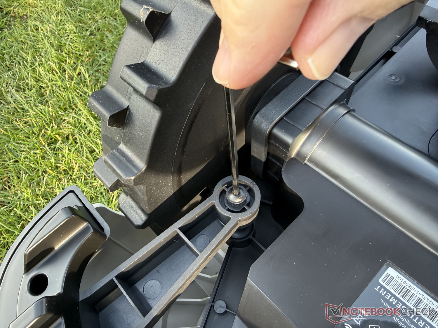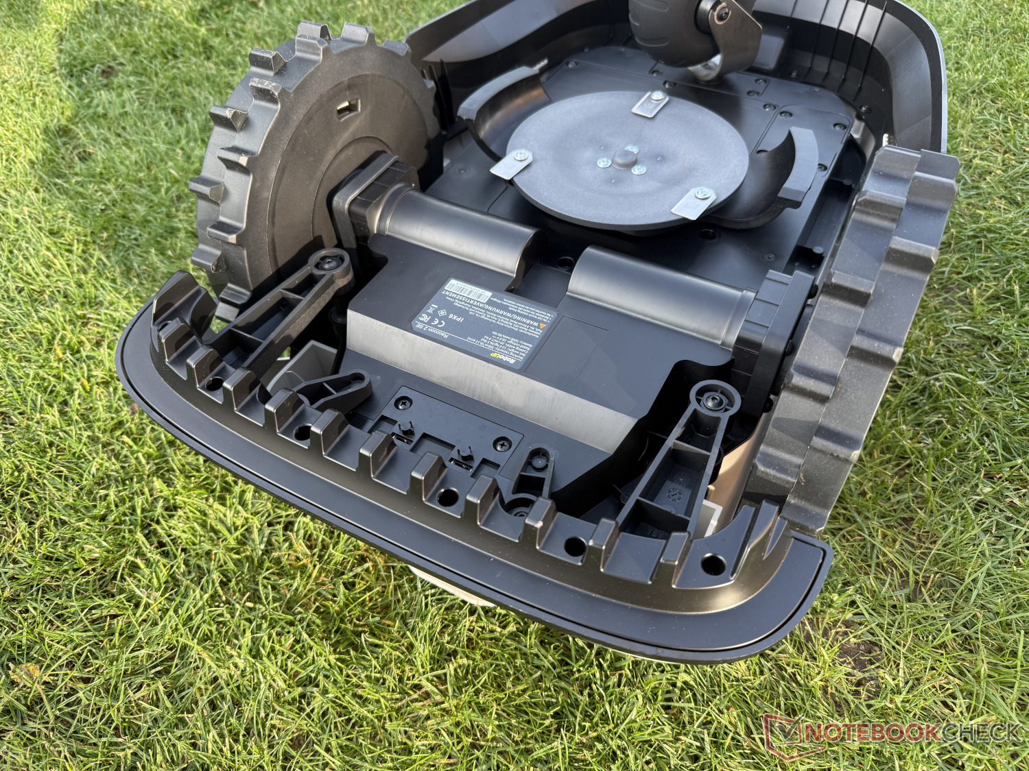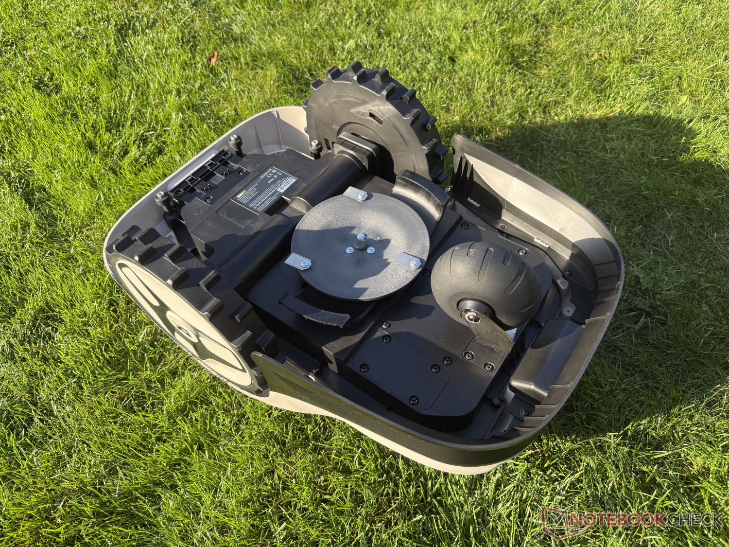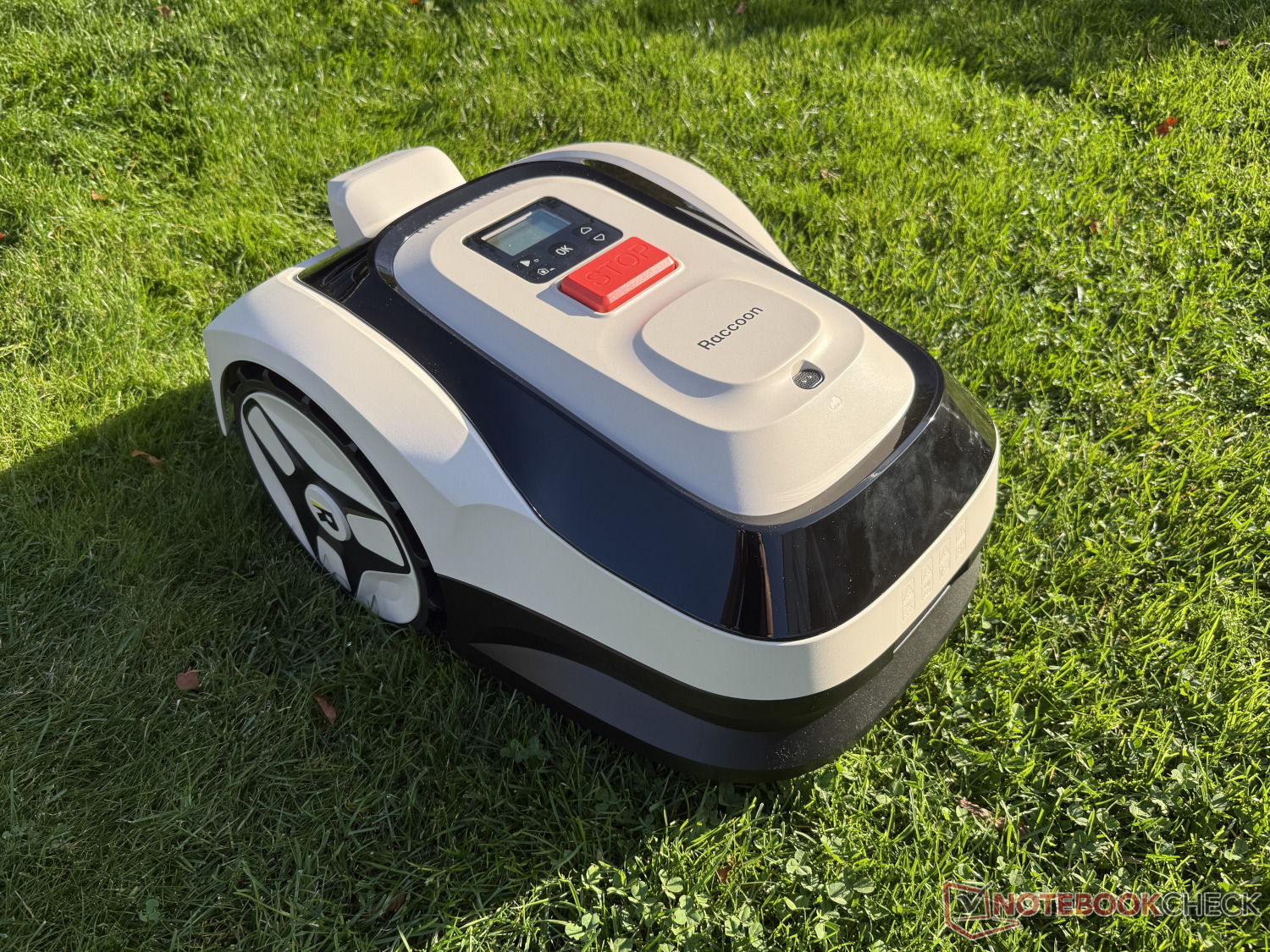 Enquanto a câmera fica em uma pequena saliência e captura a área em frente ao cortador de grama robô, na parte superior há um visor simples, cinco botões para operação, o botão de parada obrigatório em vermelho brilhante e um sensor de chuva. Há uma prática alça rebaixada na parte traseira, que facilita o transporte do cortador de grama robô, que pesa cerca de 12 kg. O acabamento é bom, o design é bastante sóbrio nas cores de um guaxinim.