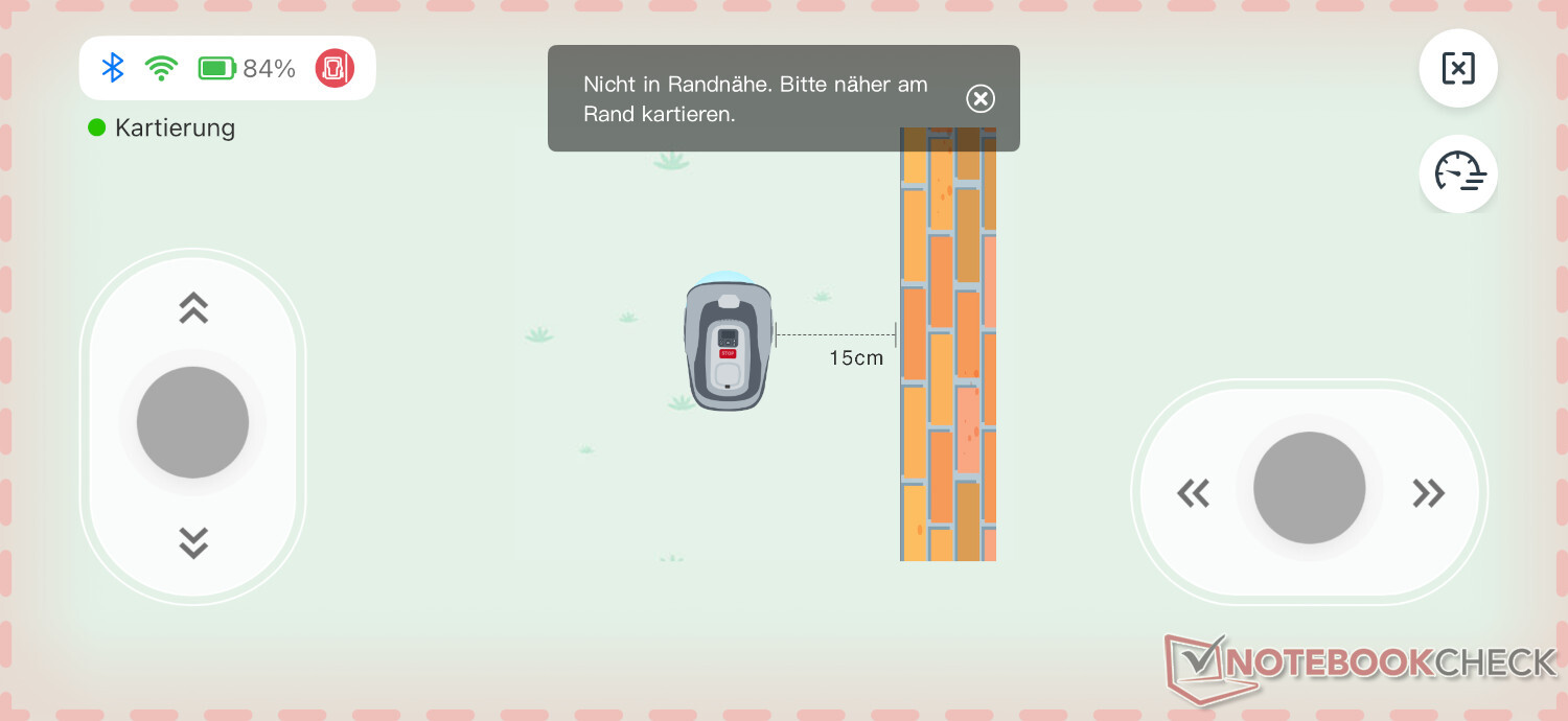 Como alternativa, o mapeamento manual também é possível. Nesse caso, o cortador de grama robótico é pilotado para uma volta introdutória usando dois joysticks virtuais na tela do smartphone. Em princípio, isso funciona bem, pois os controles são agradáveis e não muito sensíveis. Isso permite que o cortador de grama robótico seja pilotado com precisão ao longo dos limites do gramado.