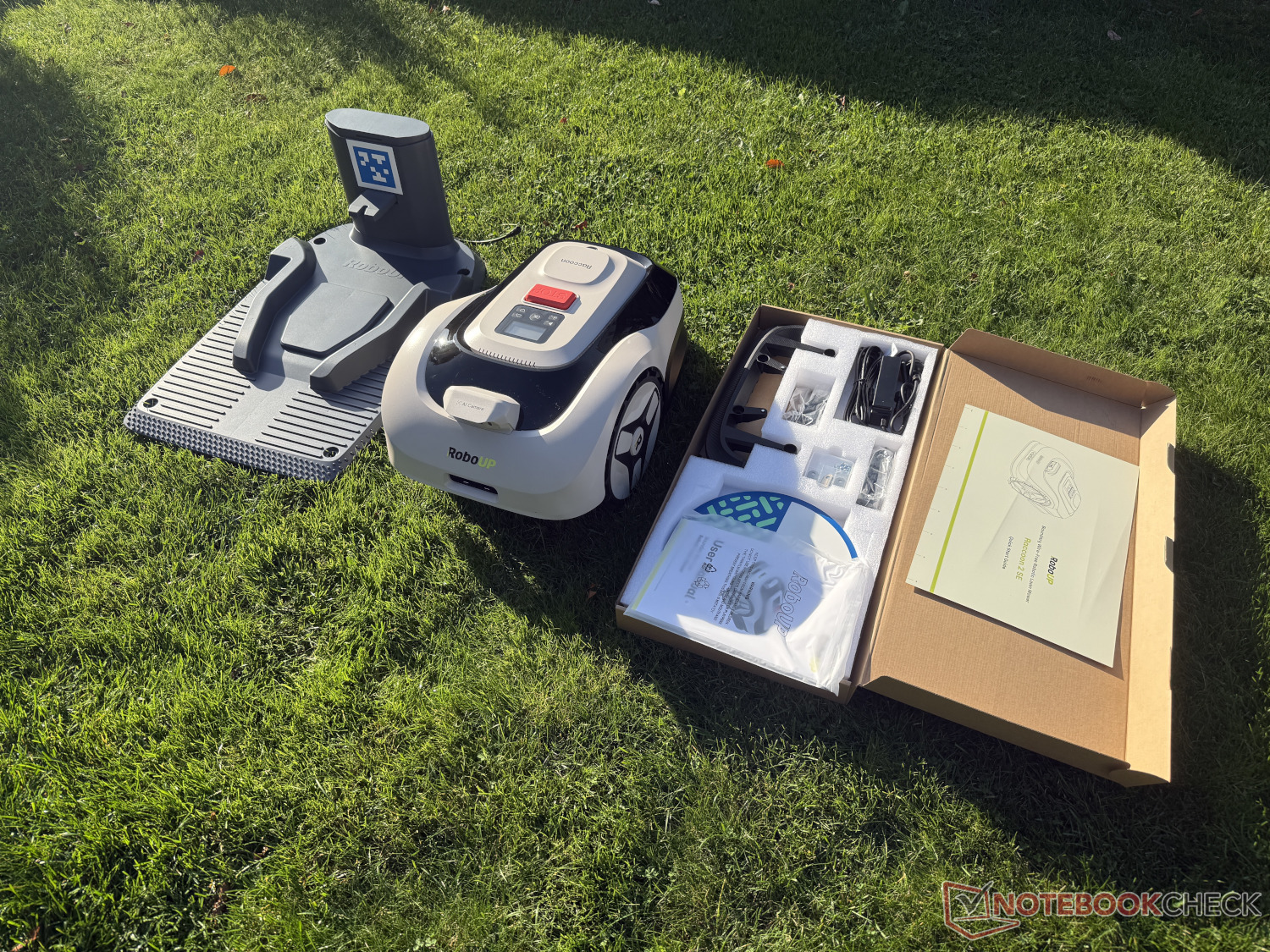 São necessárias algumas etapas antes que o senhor possa começar a cortar a grama. Além de instalar a estação de carregamento (conexão de energia e fixação com parafusos de aterramento), o para-choque dianteiro deve ser parafusado na parte inferior do dispositivo como um para-choque. As ferramentas necessárias estão incluídas, bem como dois faróis (mais sobre isso abaixo) e três conjuntos de lâminas de reposição. O RoboUp Raccoon 2 SE está pronto para ser usado.