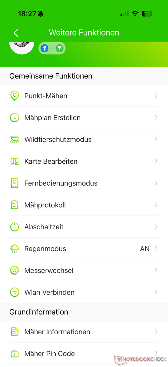 A área de gramado mapeada pode ser vista na visão geral. No entanto, ela não fornece nenhum progresso ao vivo. O senhor só pode ver os números da porcentagem do tempo de corte e o tempo de trabalho restante. Além de visualizar o status da bateria, da WLAN e do Bluetooth, o aplicativo também permite que o senhor defina o modo, a altura de corte, o modo de borda e a duração. Ao cortar a borda, o senhor pode optar por cortar até a borda do gramado ou, no caso de transições no nível do solo, ele também pode dirigir na borda.