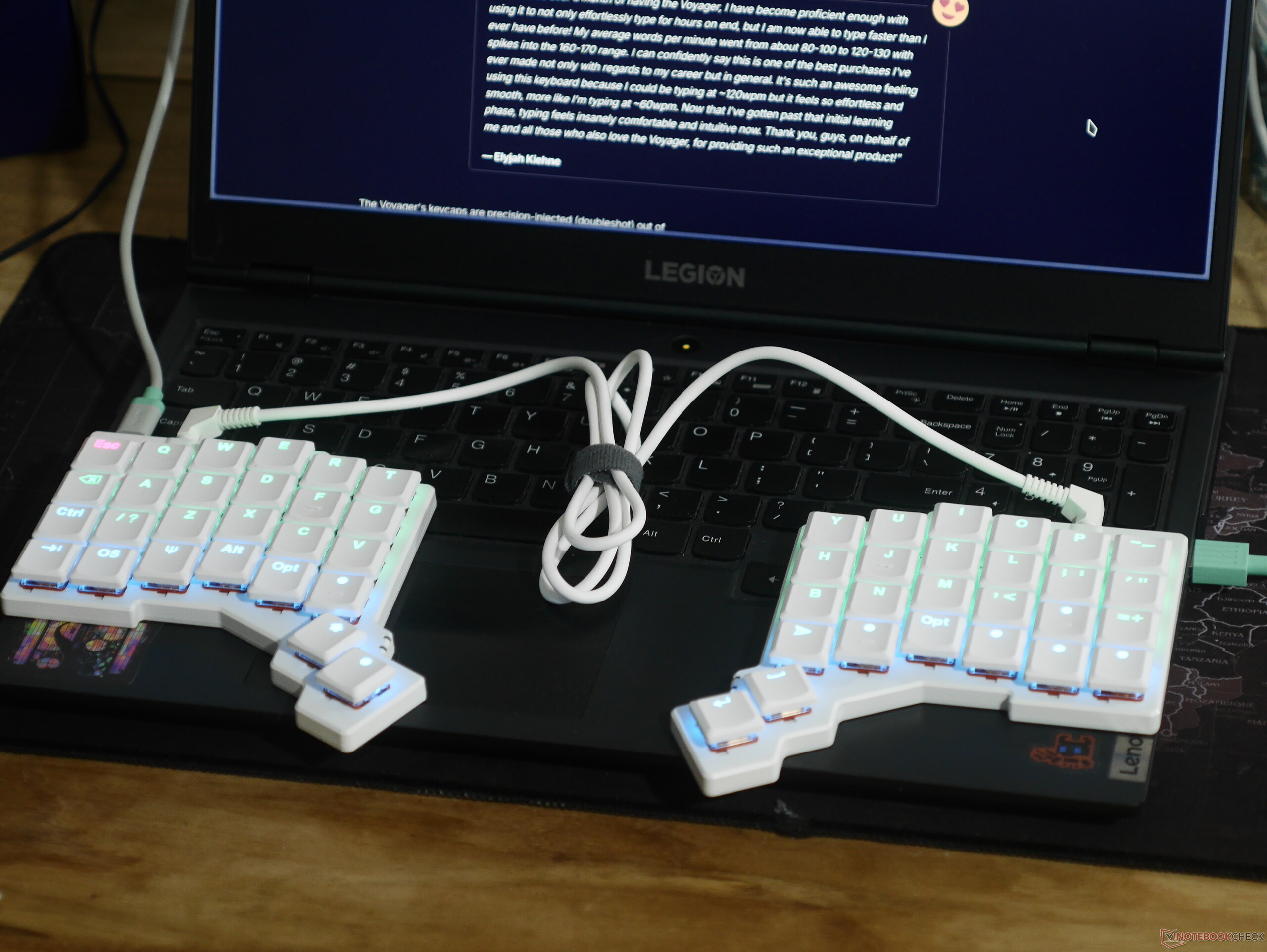 Como meu primeiro teclado dividido e escalonado colunar, o período de adaptação do Voyager foi bastante curto, com a precisão e a memória muscular retornando rapidamente, mas chegar à minha velocidade de digitação habitual de cerca de 85 WPM foi um desafio. Dito isso, o fato de poder colocar as duas metades do teclado na largura dos ombros torna as longas sessões de digitação muito confortáveis, e ficou difícil para mim voltar a usar um teclado de placa depois do Voyager. Tendo usado 40% de teclados, como o Epomaker TH40 que analisei anteriormenteeu já estava familiarizado com layouts muito menores, então usei o Oryx para personalizar meu layout e eliminar a linha de números em favor de um conjunto de teclas modificadoras na linha inferior.