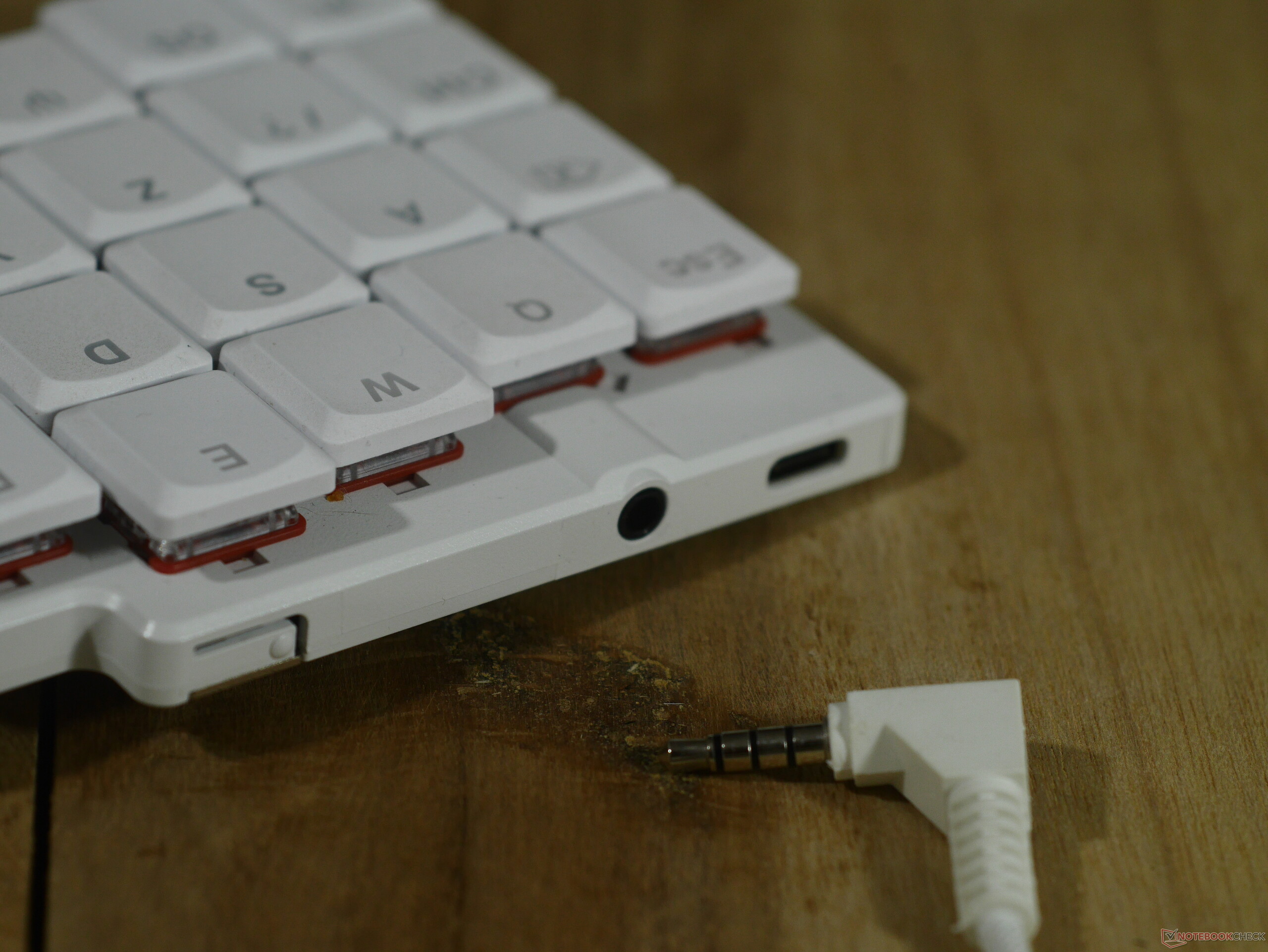 | Fator de forma e tamanho | 50% ANSI US layout, 140 × 145 mm, 8,5 mm de altura frontal, 16 mm de altura total incluindo as teclas |